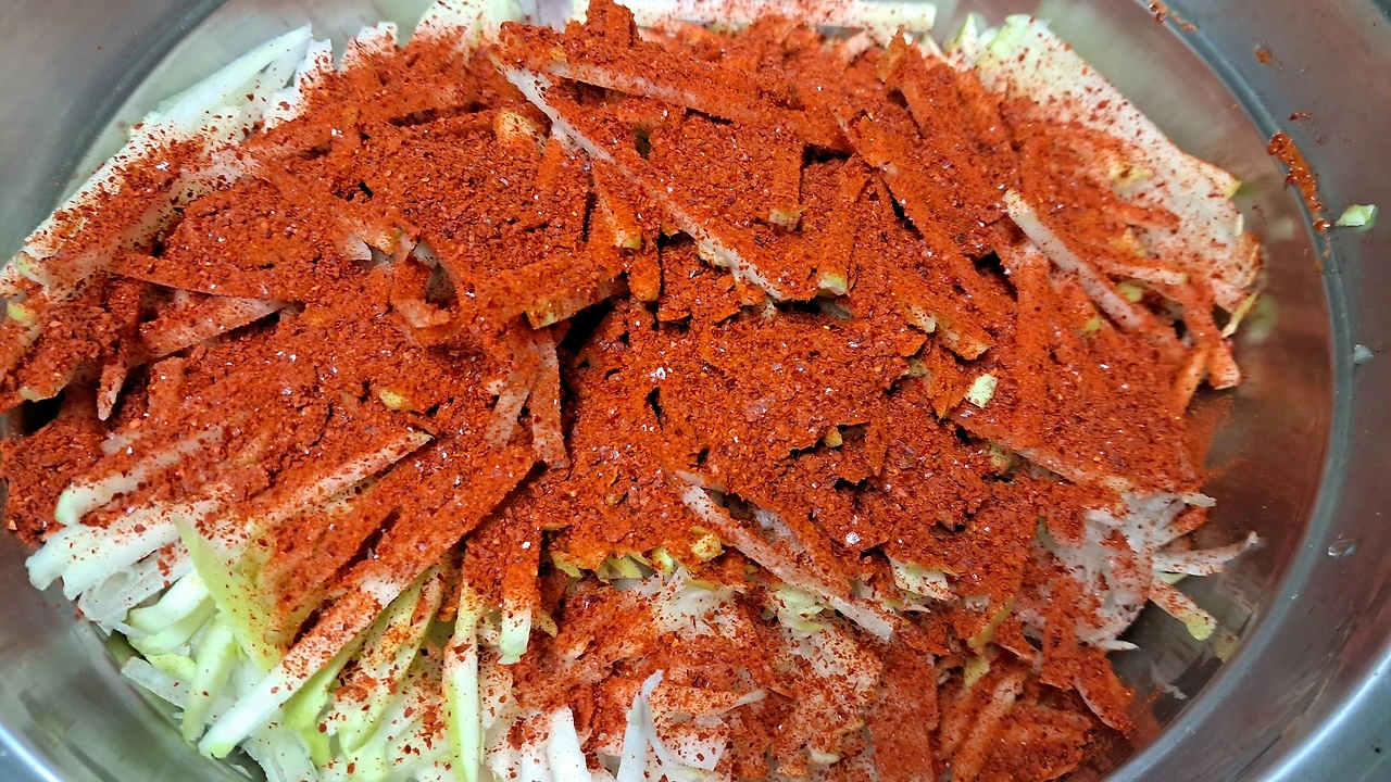 3. 무의 양을 보고 고춧가루 3~5스푼 정도를 골고루 뿌려 버무린다. 빨간 물을 입히는 거라 표현하셨다. 어머님은 일회용 장갑을 잘 안 쓰시고 맨손으로 버무리신다고도 하셨다. 무가 크니 5스푼의 고춧가루를 넣으라고 해서 그렇게 했다.