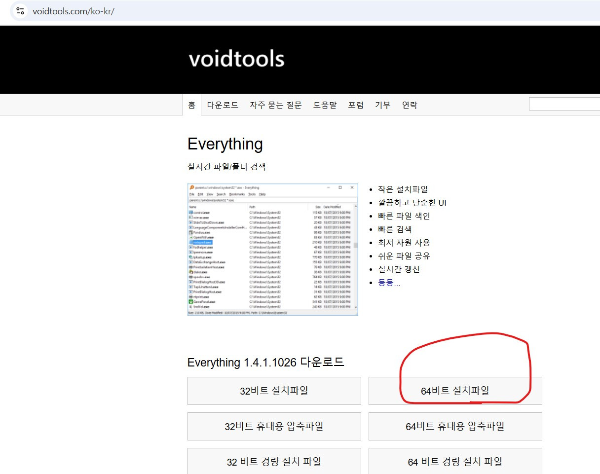에브리씽(everything) 프로그램은 컴퓨터 내에 저장되어 있는 자료 중 찾고자 하는 파일 검색에 효율적이다. 컴퓨터 자체에 깔려있는 윈도우 검색기보다 5배 빠르고 정확하다. 64비트 설치파일을 클릭하여 다운로드하면 된다. 당근색 검색 돋보기를 클릭하여 찾고 싶은 문서의 키워드를 입력하면 1초 안에 다 찾아낸다. 무료 셰어 프로그램이다.