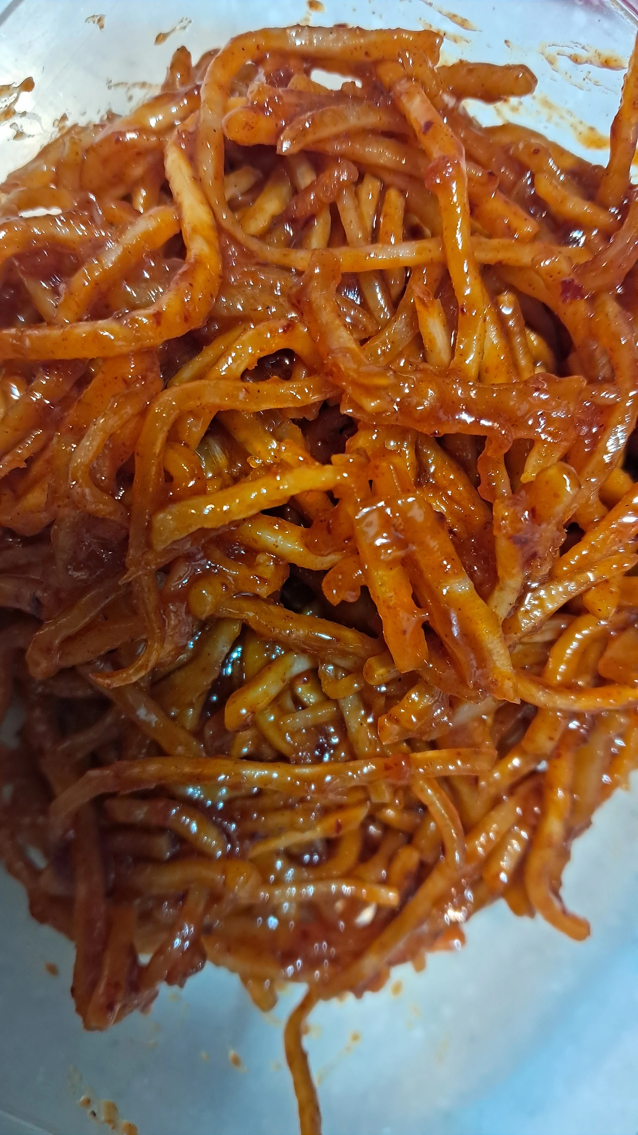 멸치볶음에 아몬드를 넣었나 싶어 자세히 보니 편으로 곱게 썬 마늘이다. 진미채 볶음이 너무 맛있어서 혹시 마트표인가 싶어 껍질을 찾았는데 없다. 진미채조림을 한 흔적이 있는 프라이팬만 있을 뿐이었다. 진미채 조림 전용 양념을 산 게 틀림없다.