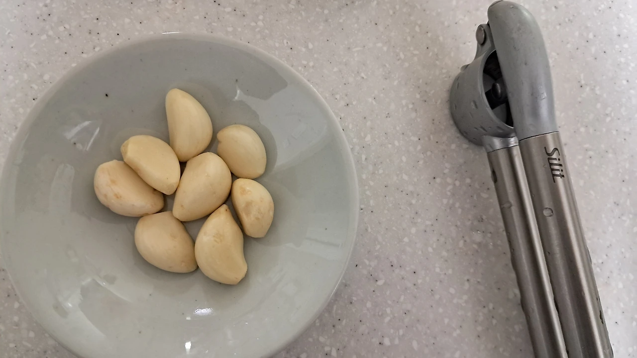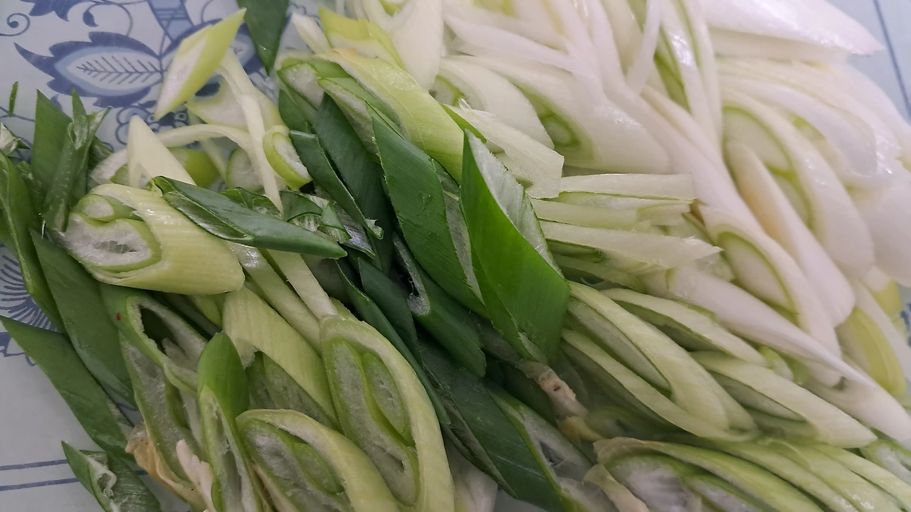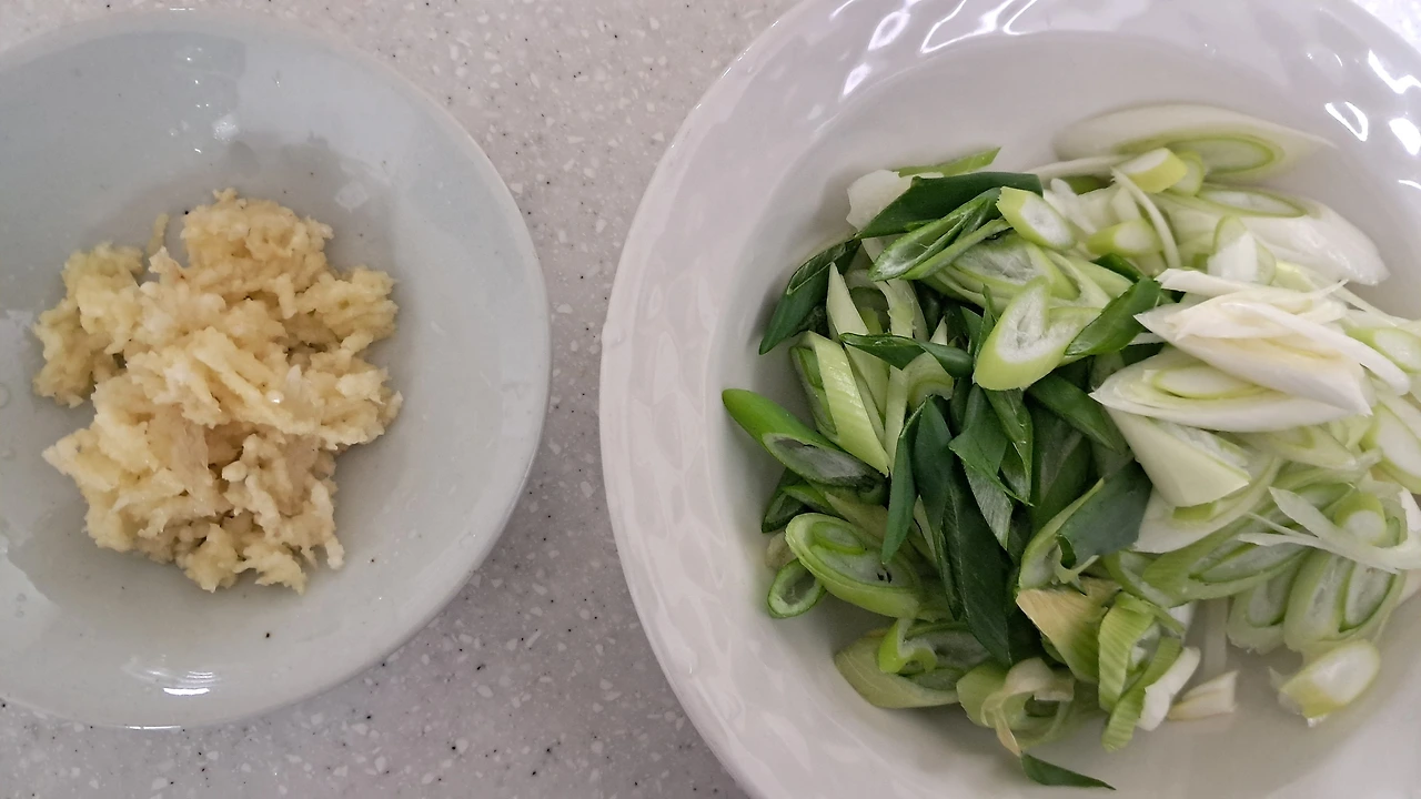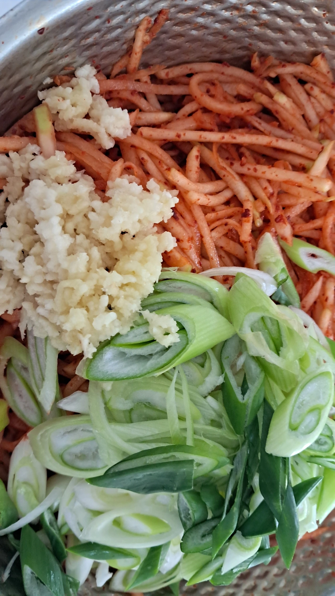 채소라고 해봐야 대파 2대, 마늘 8개만 넣는다. 대파는 최대한 얇게 어슷 썬다. 무채지를 먹을 때 대파가 두꺼우면 매콤한 대파가 맛을 방해할 것 같아서다. 마늘은 다져서 한 수저 반을 넣으라고 하셨으니 어림잡아 8개를 다져본다.