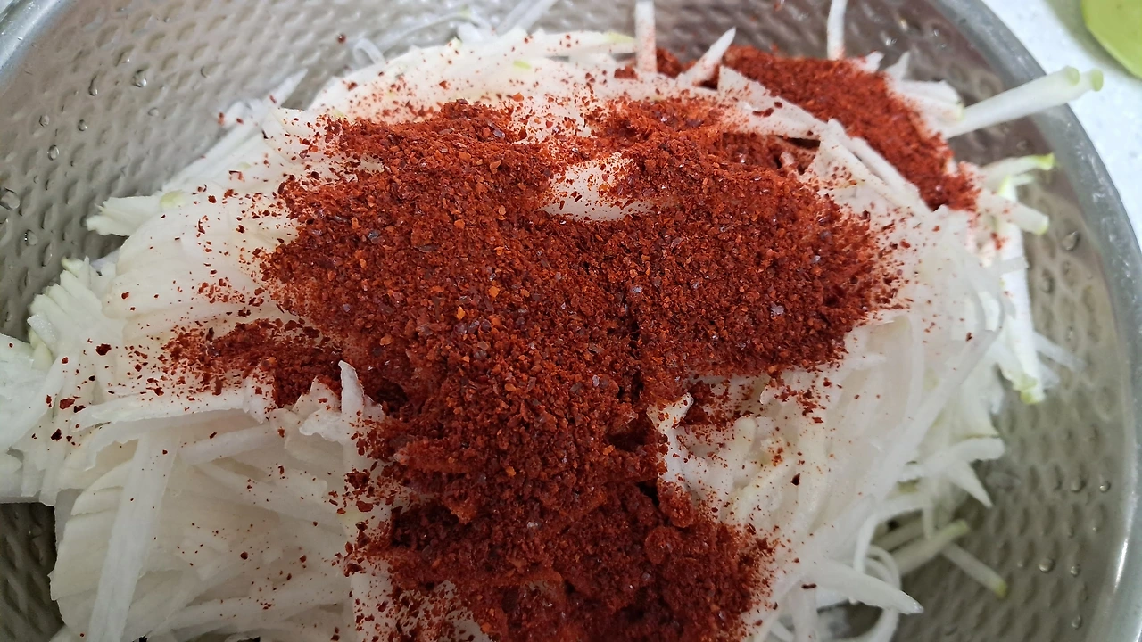 무 1개당 고춧가루 3~5숟가락을 넣어 미리 빨간 물을 들이신다고 하셨다. 설날 사용했던 무보다 크기가 살짝 작은 듯하여 고춧가루 4스푼만 넣고 골고루 빨간 물을 들여본다.