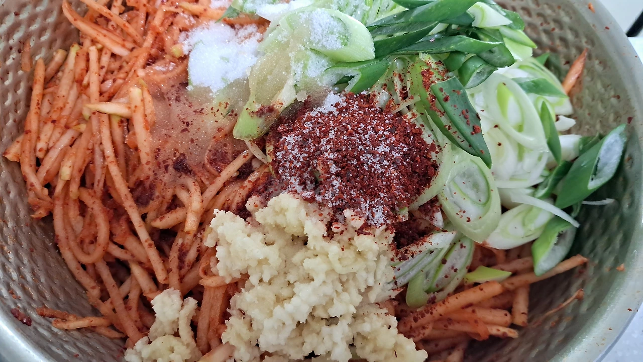 다진 마늘, 대파를 넣고, 맛소금 1스푼, 액젓 세 스푼, 설탕 세 스푼을 넣어 골고루 버무린다. 다 한 후 어머니께서는 맛을 보시고는 양념을 추가하신다고 한다. 이제까지의 계량이 무색해질 정도로 맛소금 1스푼, 액젓 3스푼을 더 추가하셨다. 나는 액젓 3스푼만 추가해 본다. 오래 두고 먹을 것도 아니고, 짜면 수습이 어렵지만 싱거우면 수습이 가능하다는 판단에서다. 싱거우면 계란프라이, 참기름, 무생채, 다른 김치나 고추장 넣고 밥 비벼 먹으면 그만이다.