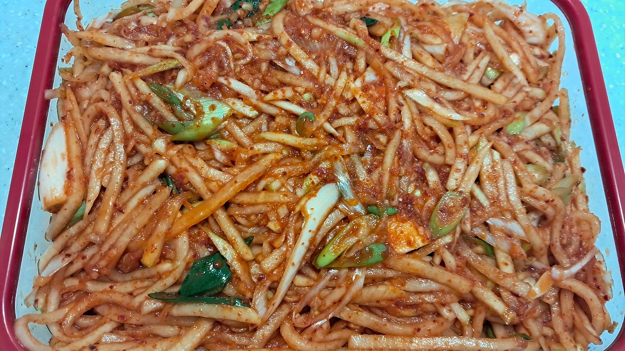 아 그리고 어머님께서 용기에 무생채를 담을 때에는 용기 모서리에 공기 공간을 남기지 말고 무생채로 꽉꽉 채워 꾹꾹 눌러 담으라고 하셨다.