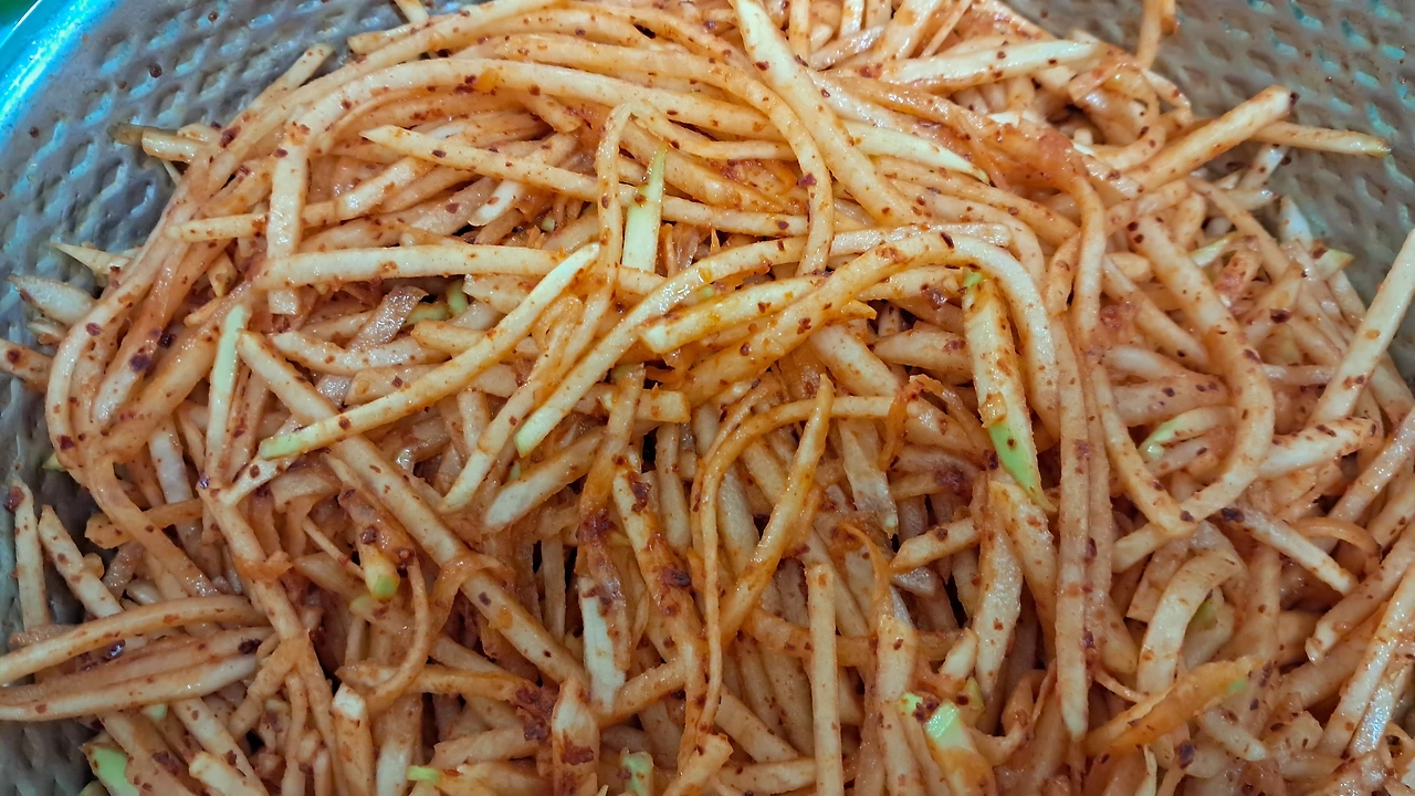 어머님표 무생채는 강력한 특징이 있다. "아삭함"이다. 이유를 모르겠는데 마지막 한입까지 아삭하다. 그 아삭함이 맛을 배가시킨다. 전라남도에서는 사람들이 황석어젓, 밴댕이 젓, 새우젓까지 모두 손수 담아 요리에 응용했다. 풍미가 가득한 김치에 익숙해서인지 서울 쪽 김치는 밋밋해서 처음에 적응을 못했다. 세월이 지나 서울 김치만의 매력을 찾았다. 맛이 깔끔하고 색이 곱고 아삭하다. 서울김치 특유의 아삭한 깔끔함이 있다. 시어머님표 김치가 그렇다.