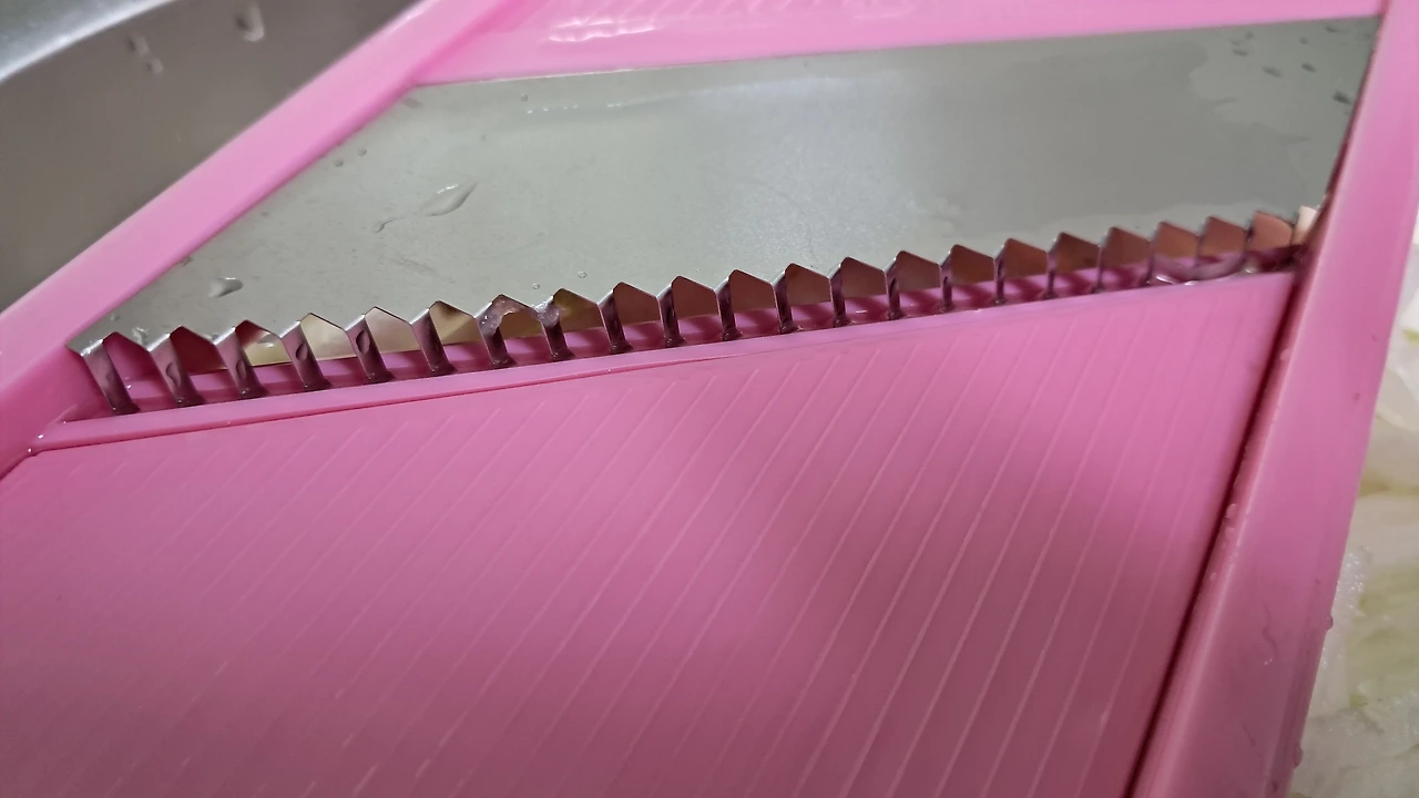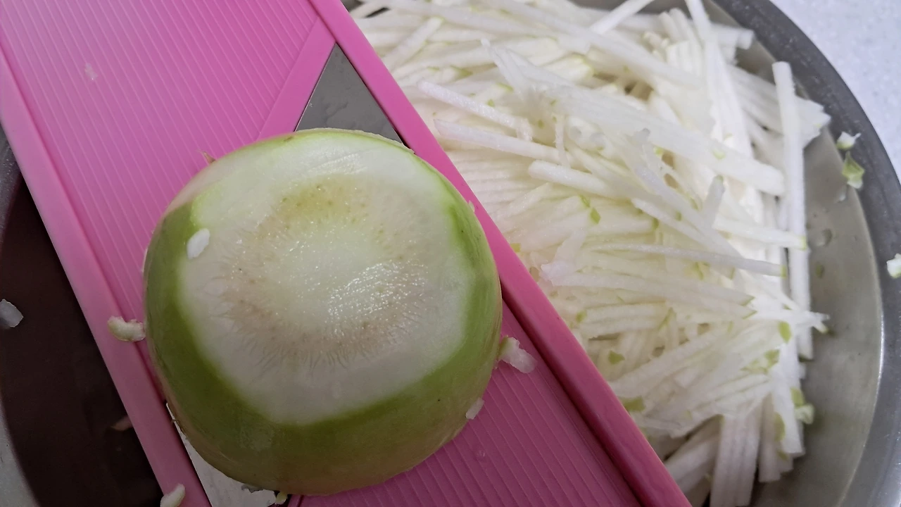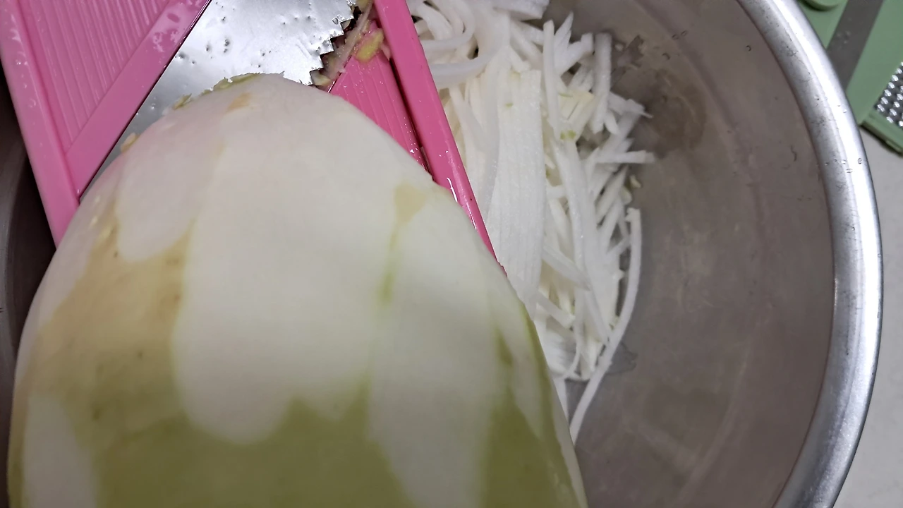 손 다치니 통째로 들고 비스듬히 측면부터 갈라고 한 기억이 난다. 비스듬히 갈다 보니 무채가 길게 뽑힌다. 아삭함이 장점이니 짧지 않고 길게 나와도 괜찮다.