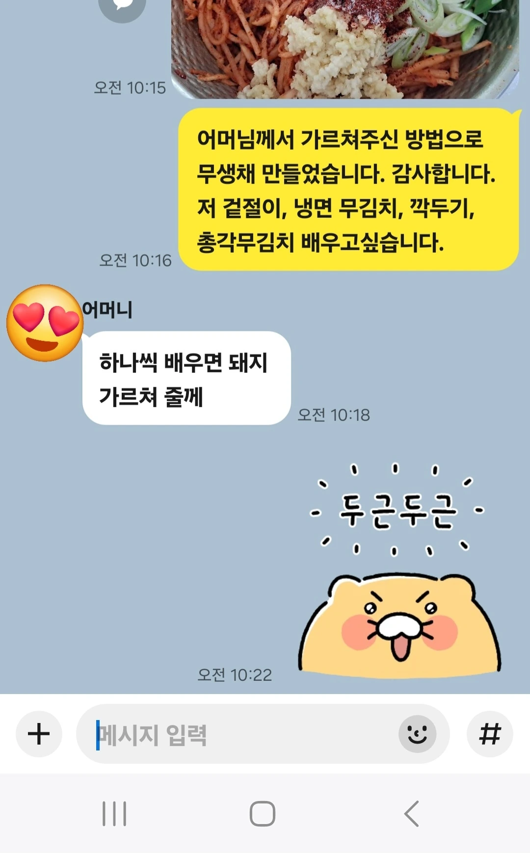 어머님께 가르쳐주셔서 감사하단 메시지와 어머님 김치중에 남편과 아이들이 홀릭하는 다른 김치들인 겉절이, 냉면 무김치, 깍두기, 총각무김치를 배우고 싶다고 말씀드렸다. 앞으로 하나씩 가르쳐주신다고 한다.
