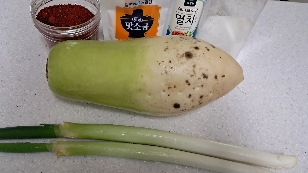고춧가루, 맛소금, 설탕, 무 1개, 멸치액젓, 통마늘 8개, 대파 2대 끝.