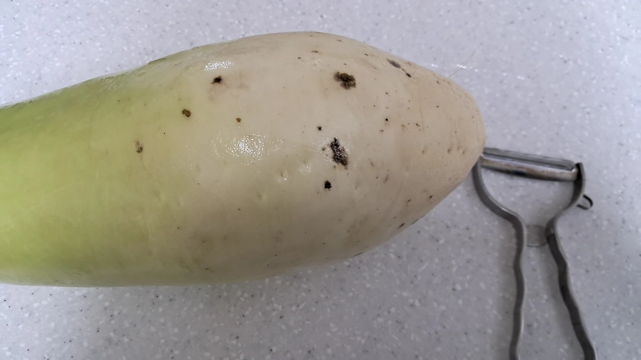 무 1개에 지난주까지 1980원이었는데 2500원이다. 아주 얇게 낭비 없이 양끝을 잘라내 버리라고 하셨다. 그리고 무껍질을 벗기지 않는다고 하셨다. 그런데 남편이 사 온 무의 몸통에 검은 게 있다. 다음에 무를 고를 때는 몸통이 깨끗한 걸 골라야겠다. 필러로 몸통 부분 부분 검은색만 조심히 얇게 벗겼다. 시어머님의 낭비하지 말라는 조언이 귓가에 맴돈다.