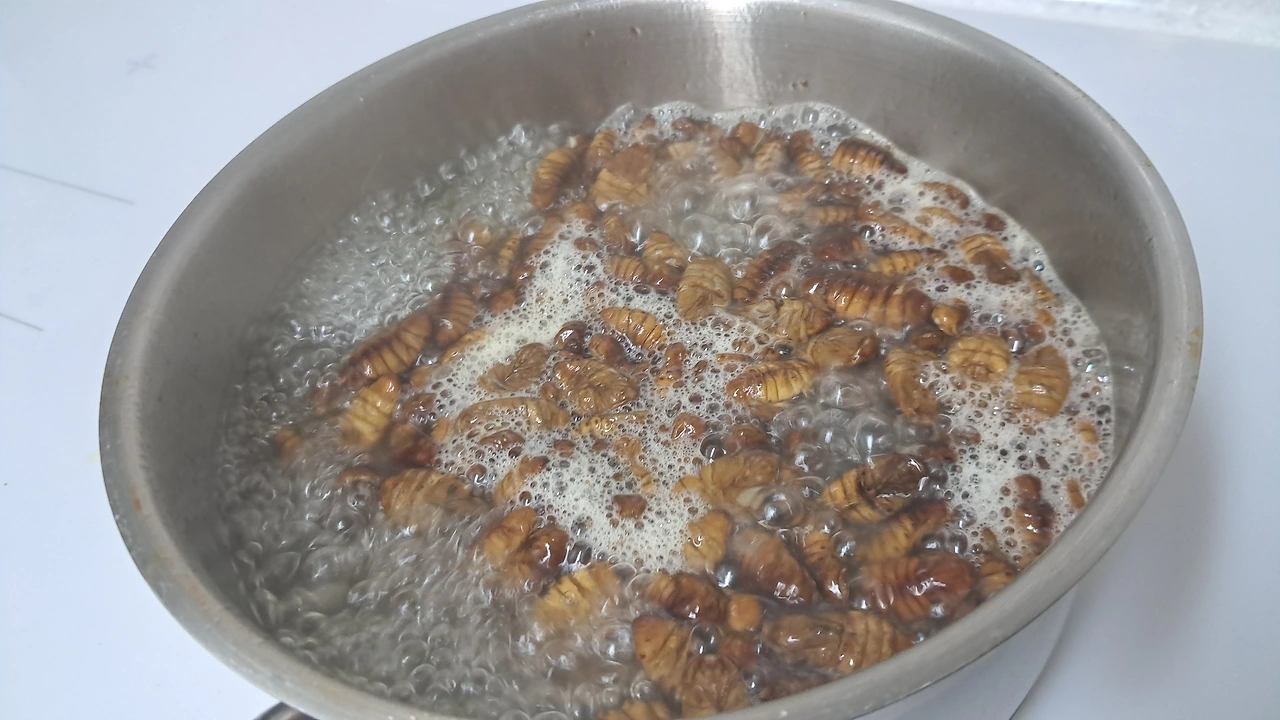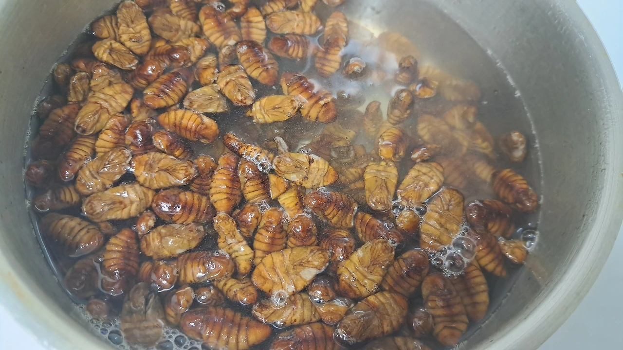 3) 끓는 물에 번데기를 넣고 끓어오르면 저으며 데친다.