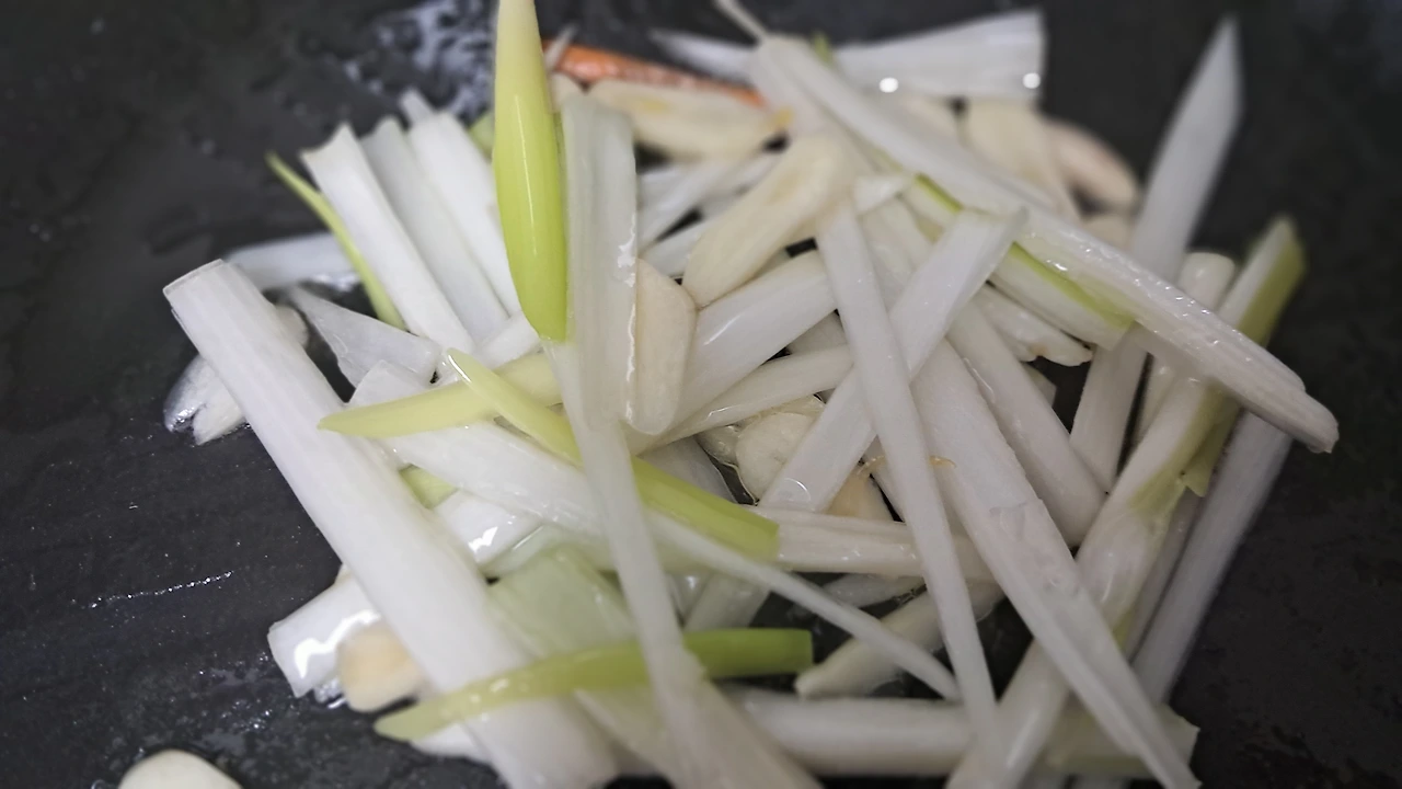 2) 식용유 2스푼을 넣고 파, 양파, 편마늘 넣어 센 불에서 볶아 파기름을 낸다.