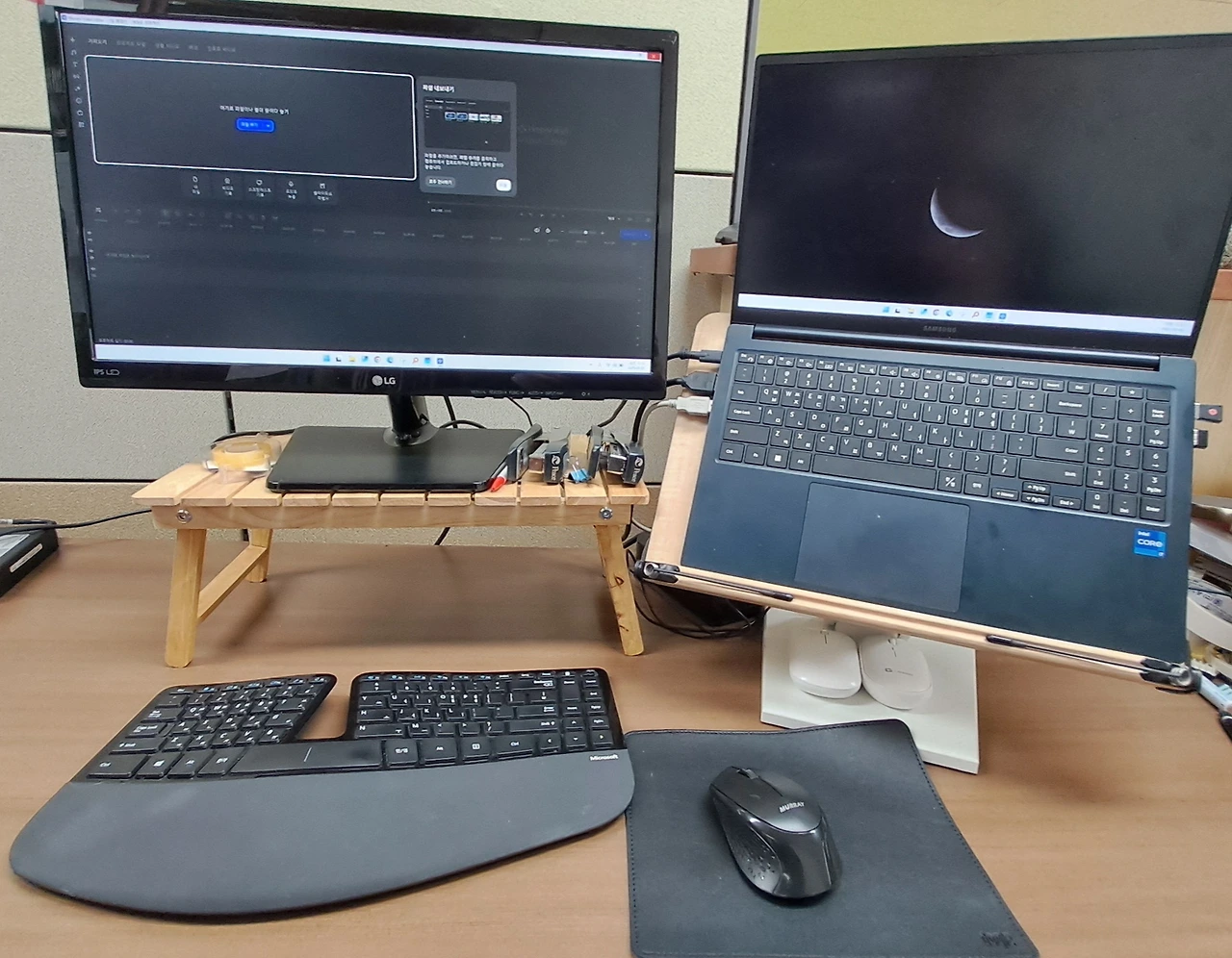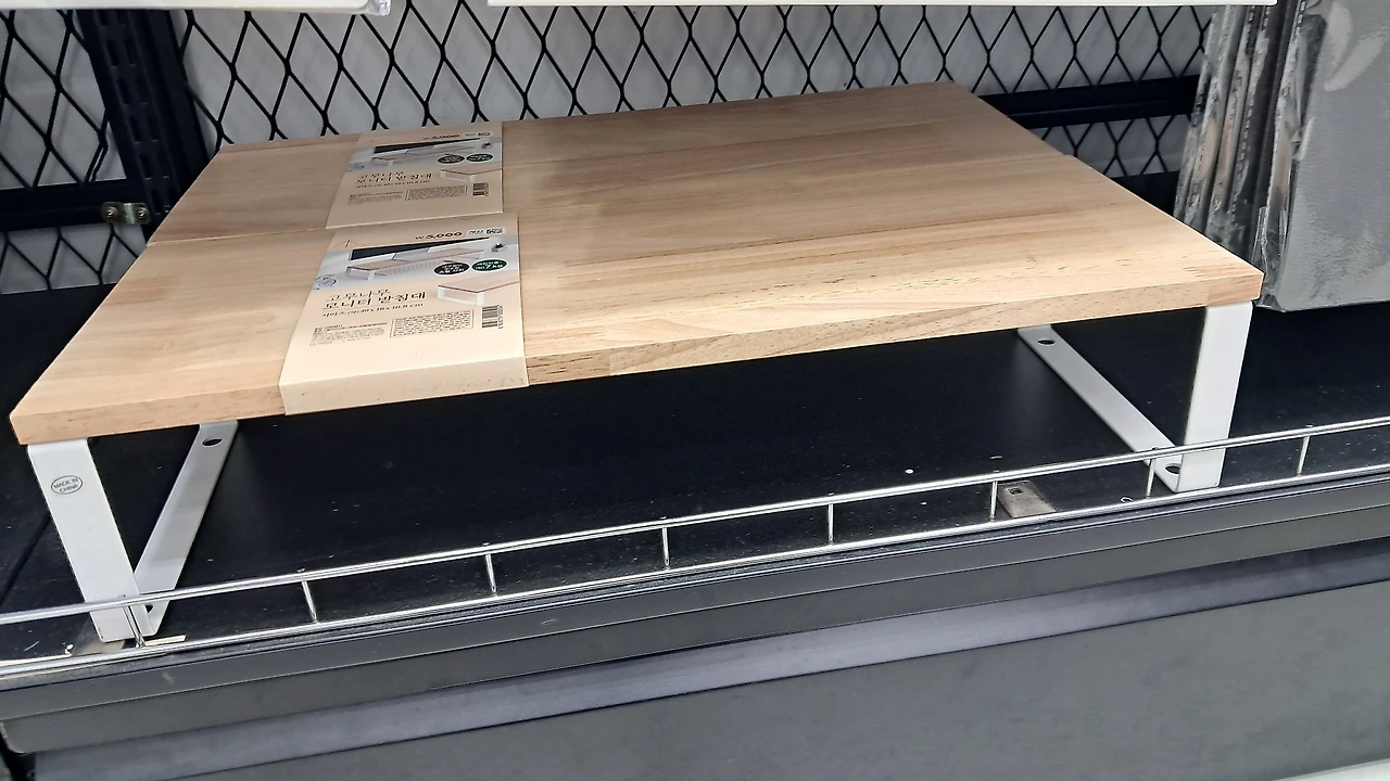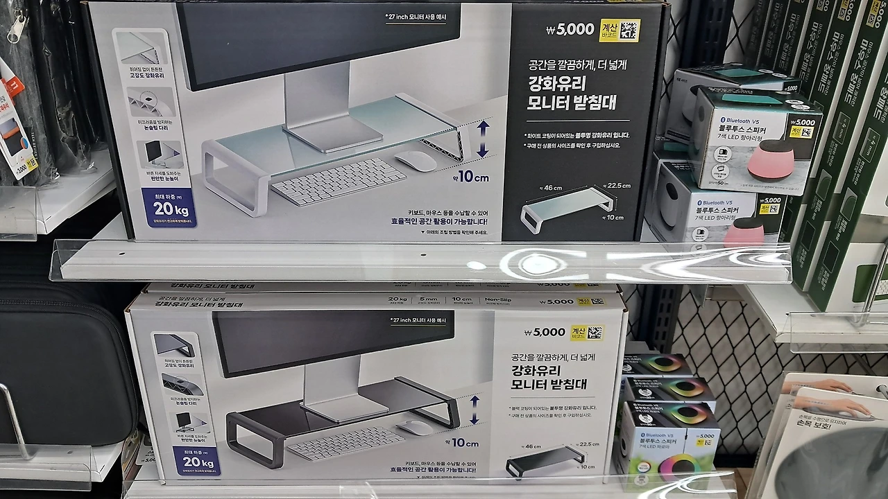 5분 15초부터 운동법이 나오는데 1.5 배속으로 설정하고 컴퓨터 모니터로 보면서 따라 한다. 일자목 증상자는 모니터 중앙이 눈높이보다 위로, 거북목 증상자는 모니터 중앙과 눈높이가 수평이 되도록 모니터를 위치시켜야 된단다. 듀얼 모니터 사용 시 작은 화면의 노트북은 오른편에 놓고, 듀얼 모니터용 대형 모니터를 메인 화면으로 보는 게 낫다고 의사가 본인의 모니터 높이를 보면서 설명해주었다. 모니터 받침대는 다이소에서 2,000원~5,000원인데 집 책상에는 약 10센티 높이의 흰색 쇠프레임 거치대를 선택했고, 직장의 책상은 좀 낮아서 15센티 화분 받침대를 구입해서 세팅했다.