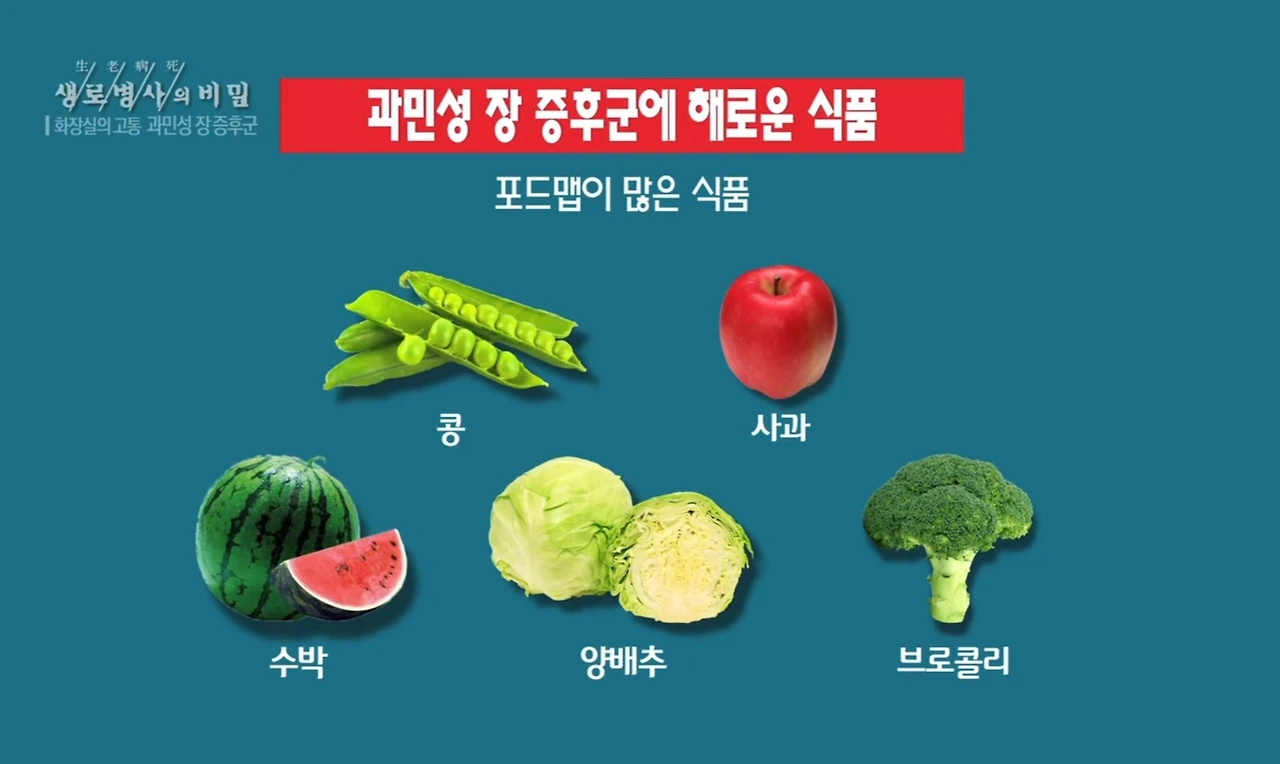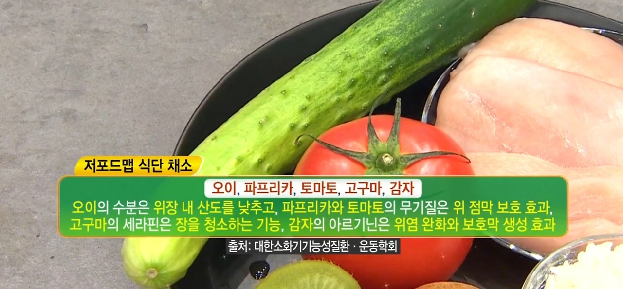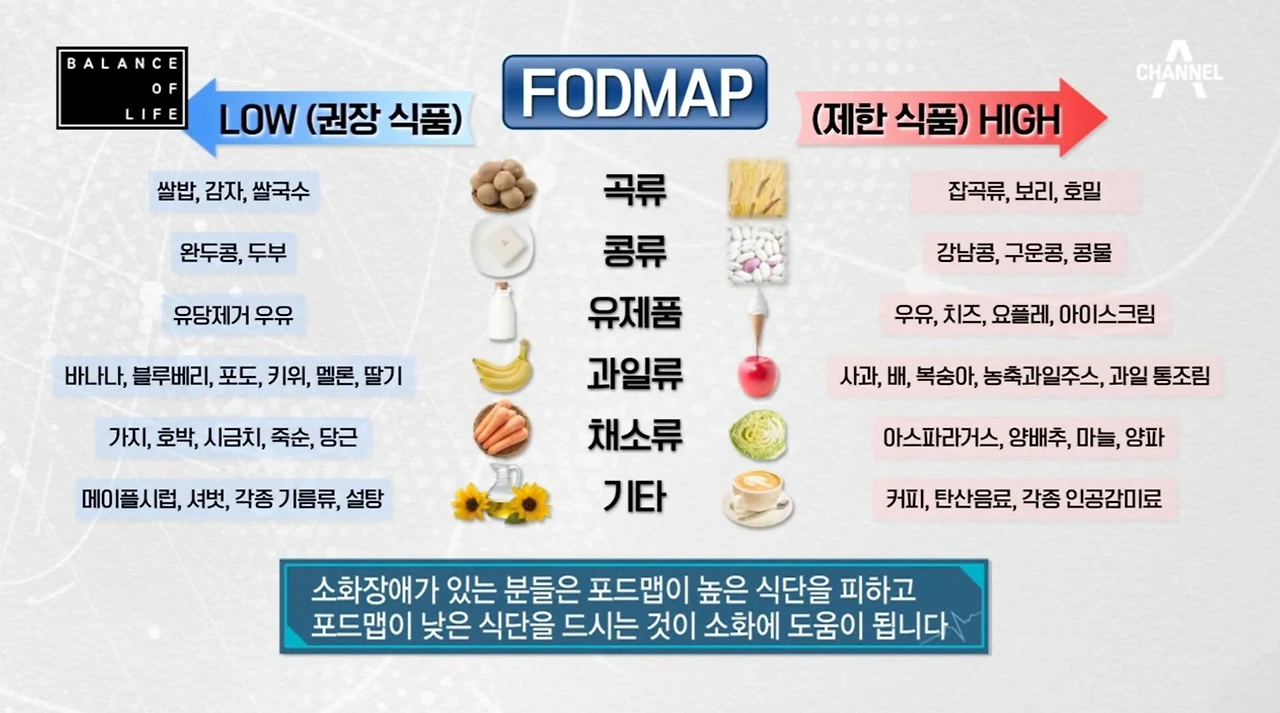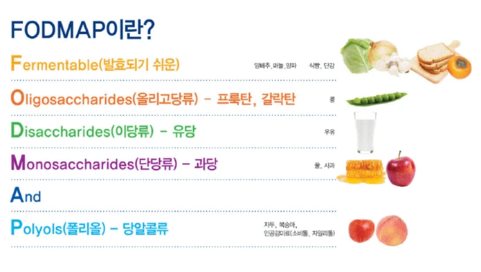 포드맵은 장에서 흡수되지 않고 쉽게 발효되어 설사나 복통, 복부팽만을 유발하는 올리고당, 이당류, 단당류, 폴리올을 일컫는 말이라고 한다. 과민성 장증후군 환자는 포드맵이 적은 음식을 섭취하는 것이 좋단다. 환자들에게는 두 가지 방식이 있는데, 첫 번째는 저포드맵 식단을 하는 것이고, 두 번째는 어느 정도 저포드맵 식단에 적응되었을 때 고포드맵 식재료를 하나씩 늘려보면서 적응하는 것이란다.
