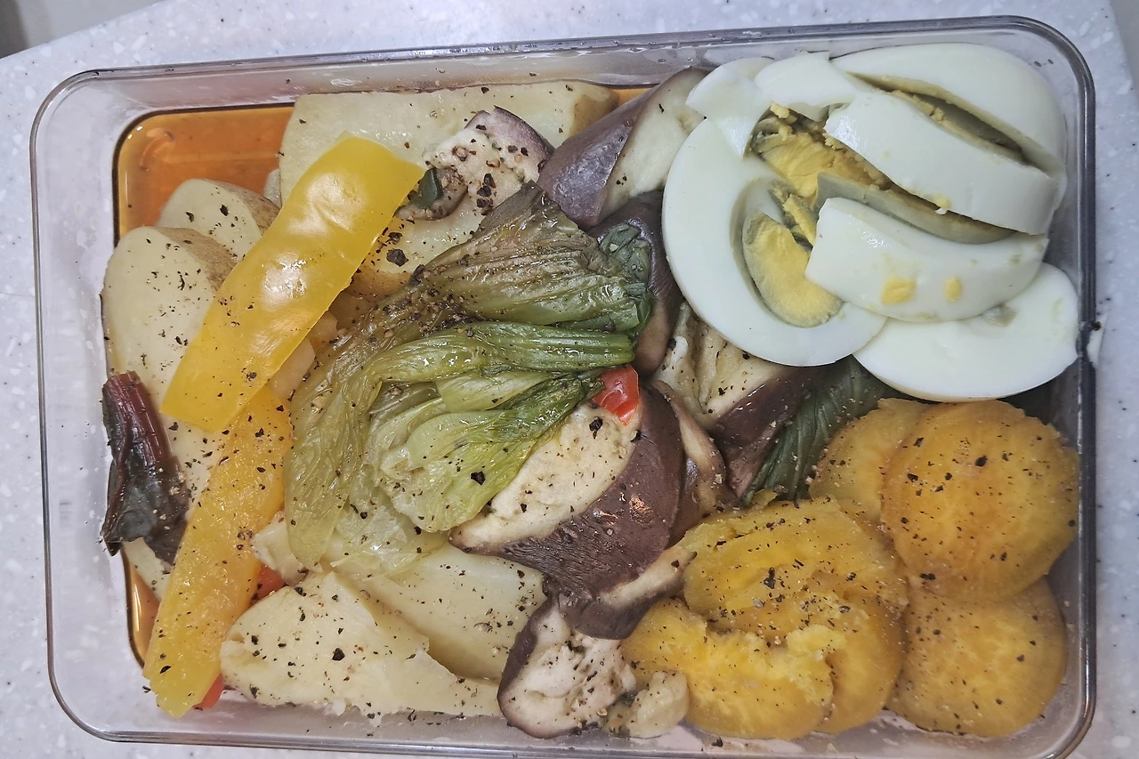 요즘 채소가 저렴하다. 매일 아침 찜냄비에 채소를 찐다. 슬라이스 친 감자나 고구마가 딱딱하게 익을 정도로 찌고 불을 끄고 잔열로 뜸을 들인다. 점심 도시락용 1개와 귀가해서 먹을 저녁 식사용 도시락 1개를 싼다. 하나는 직장에서, 하나는 집에서! 하루 지난 찐 채소는 먹지 않기에 매일 2개의 도시락을 싸고, 하나는 냉장고에 보관해 놓고 출근한다. 아침식사는 일반 한식을 먹는다.