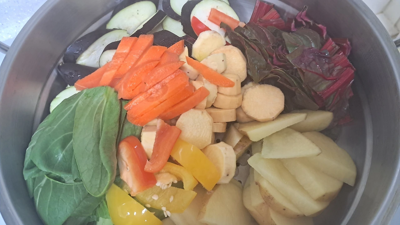첫 야채찜 재료로 근대, 청경채, 당근, 가지, 고구마, 감자, 파프리카를 활용했다. 계란은 채소와 함께 찌면 비린맛이 입혀질까 봐 따로 찜기에 쪄놓고 사용했다.
