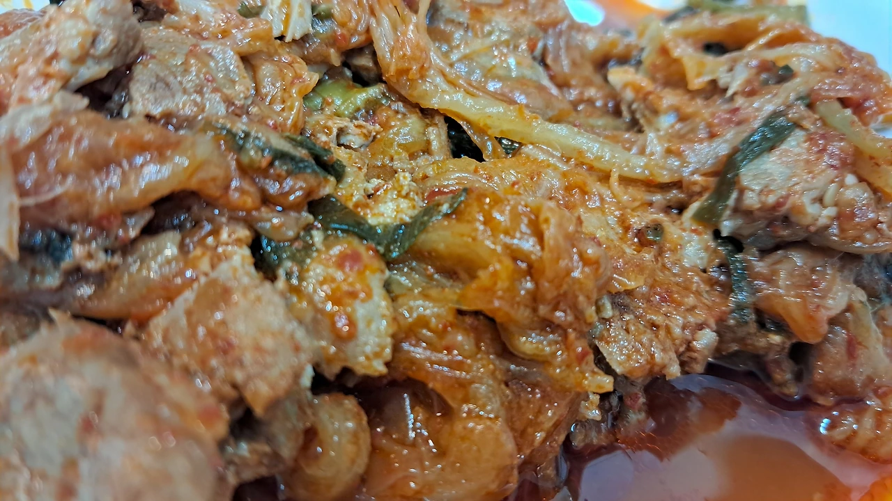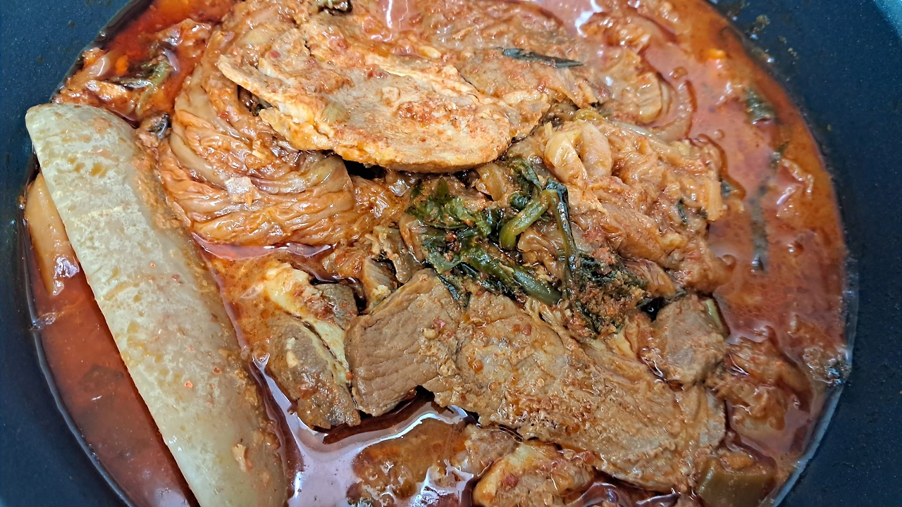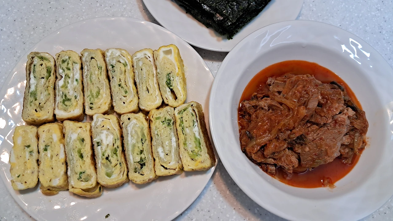 딸내미의 주문을 받아 오늘 아침 남편이 준비한 음식은 목살 김치찜과 계란말이다. 재래시장에서 산 구운 김도 세트다.