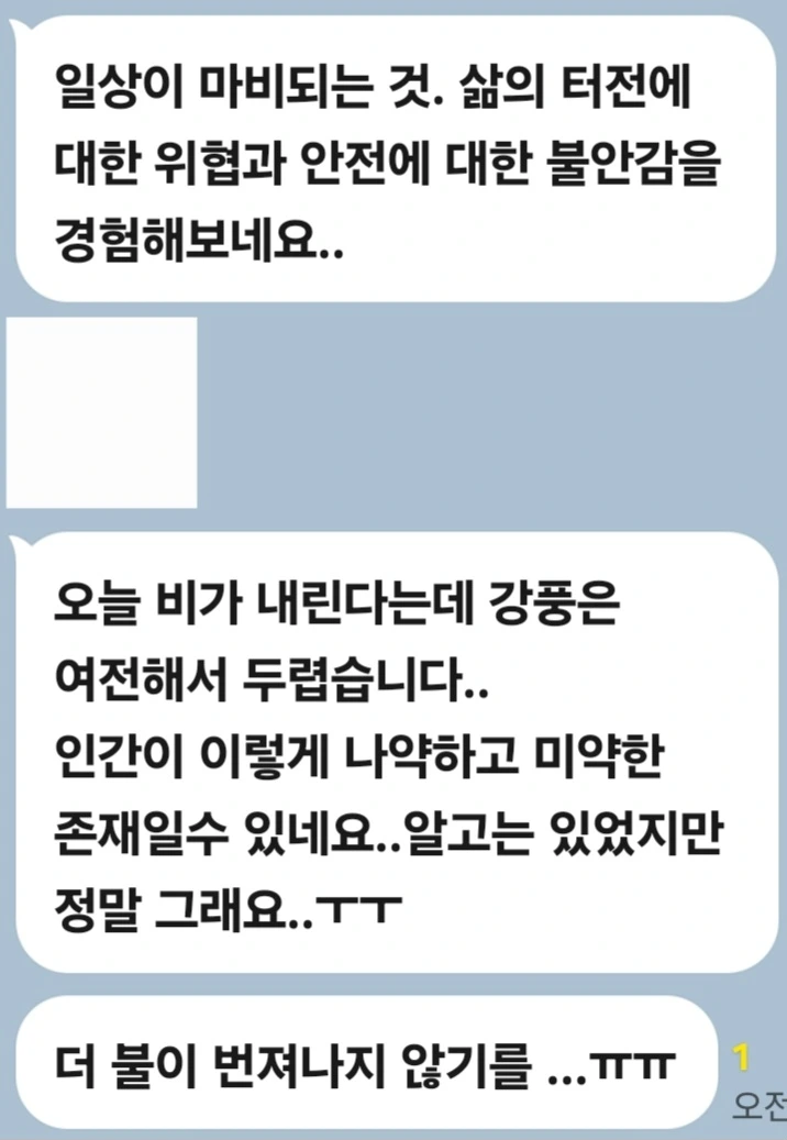 아침에 경북에 사는 지인의 연락을 받았다. 삶의 터전에 대한 위협과 안전에 대한 불안감을 느낀다는 게 어떤 건지 피부로 와닿았다. 강풍 없이 비가 내리길 간절히 바란다.