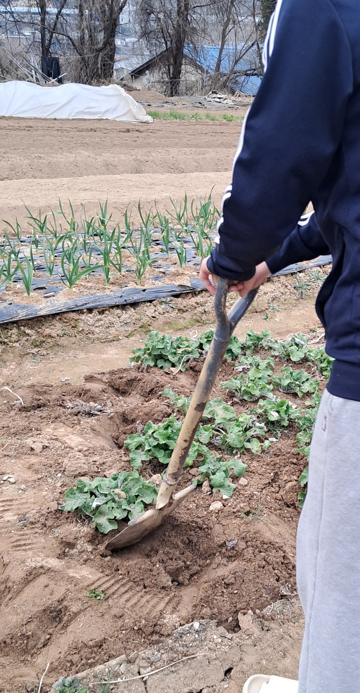 아들은 삽으로 잎우엉과 부추를 흙까지 한 삽씩 뜨는 작업을 했고, 딸은 이동된 작물을 호미로 북돋우며 심는 작업을 했다. 나는 시금치, 대파, 잎우엉 수확과 쓰레기 정리를 했다. 밭 가장자리에 실하게 자란 냉이도 캤다.