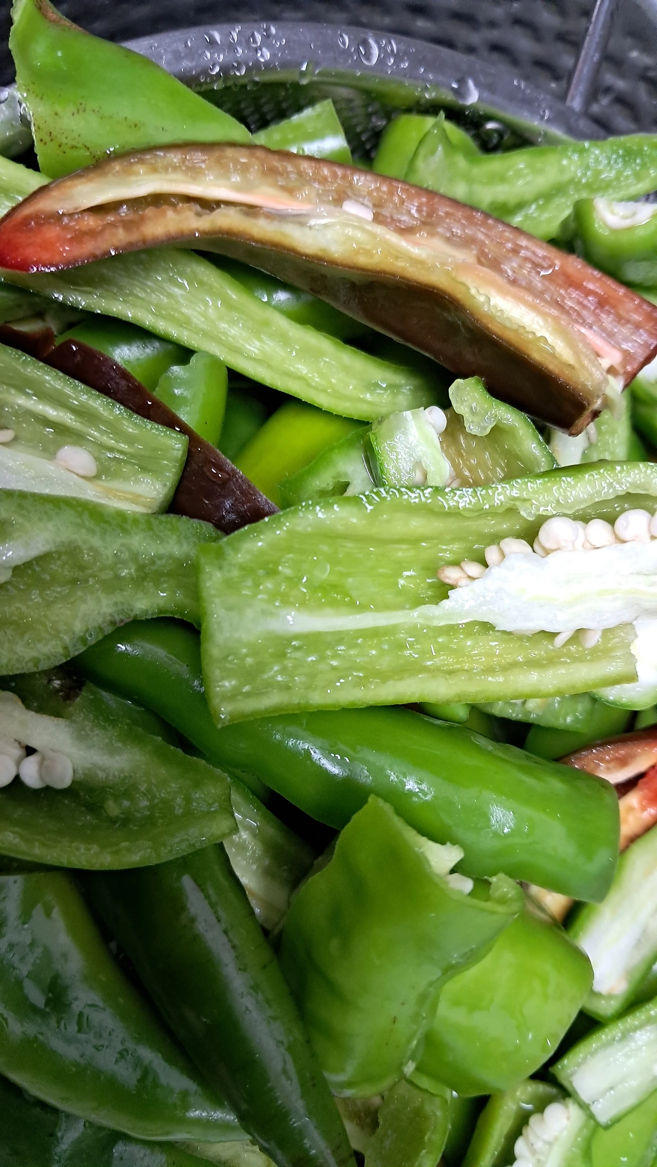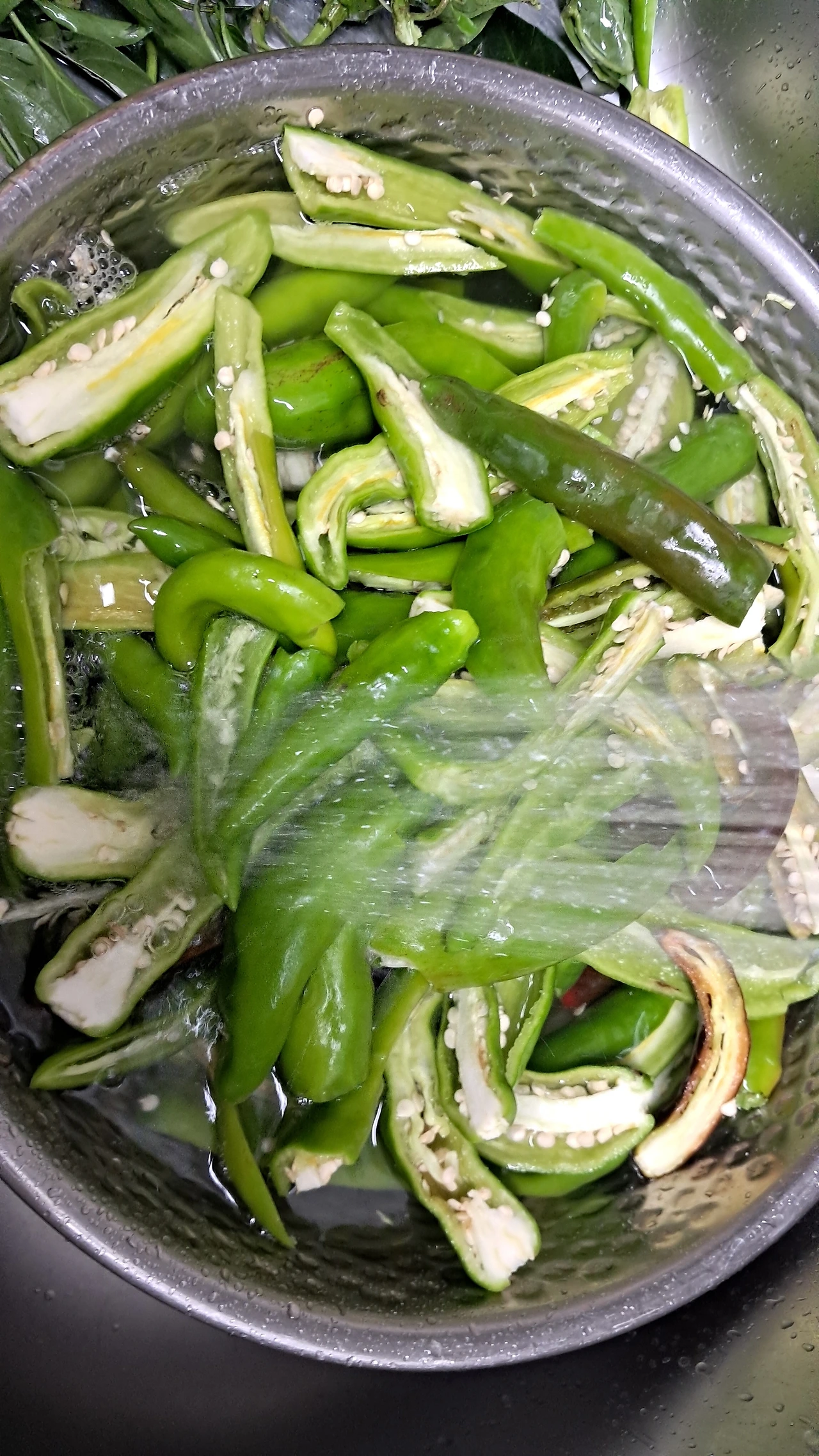 2~3번 물에 흔들어 헹궈 고추씨를 어느 정도 제거한다. 매운맛도 희석시킨다. 채반에 받쳐둔다.