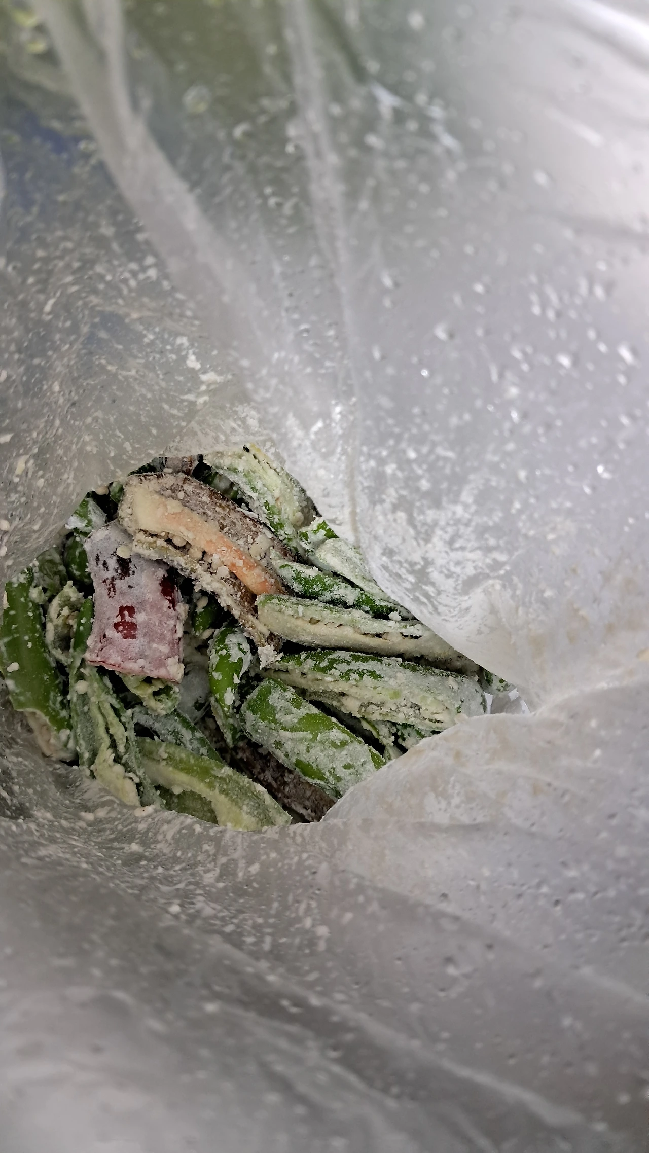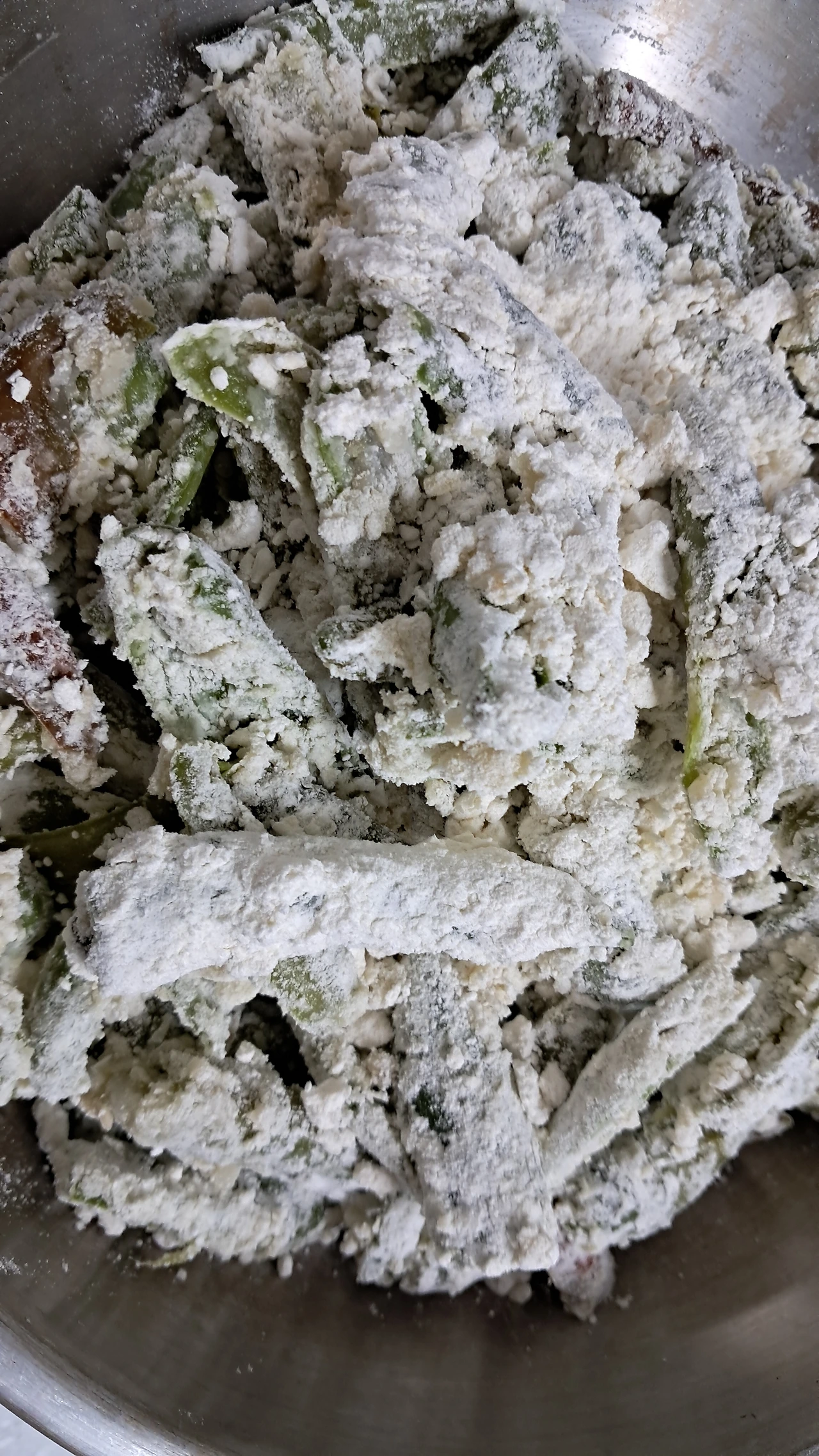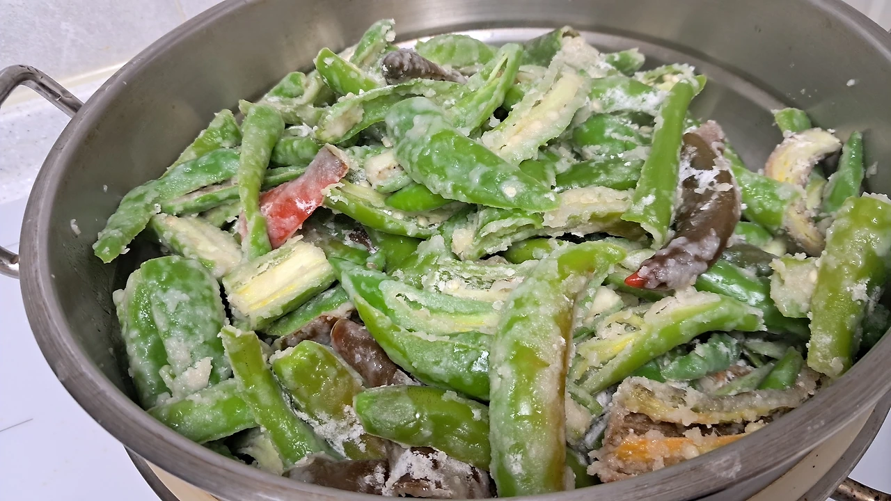 비닐봉지에 밀가루를 적당량 넣고 고추를 쉐이킷 한다. 찜솥에 물이 팔팔 끌을 때 밀가루 묻은 고추를 찐다.