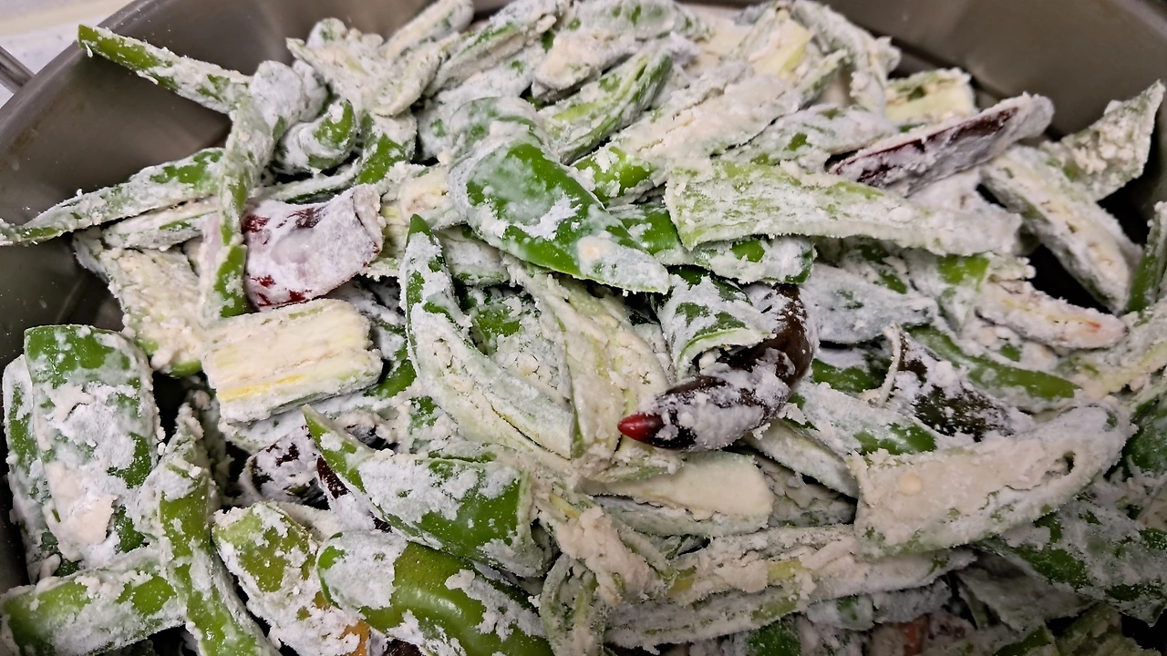 튀김가루 한 컵을 큰 볼에 담고 그 위에 쪄진 고추를 넣는다. 고추에 골고루 튀김가루를 코팅시킨다.(뜨거움 주의)
