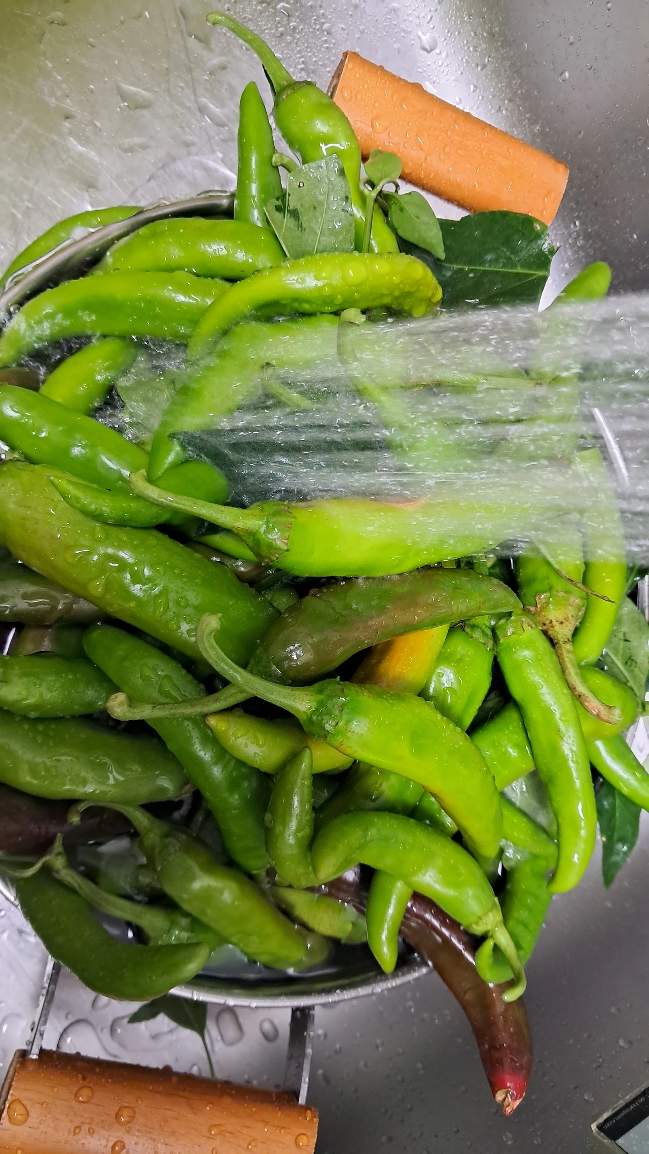 흐르는 물에 고추를 씻는다. 설탕, 소금 각 2스푼씩 녹여 샤워시킬 물을 대기시켜 둔다.