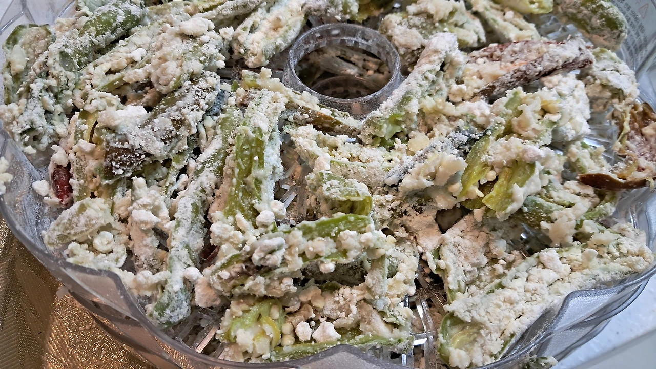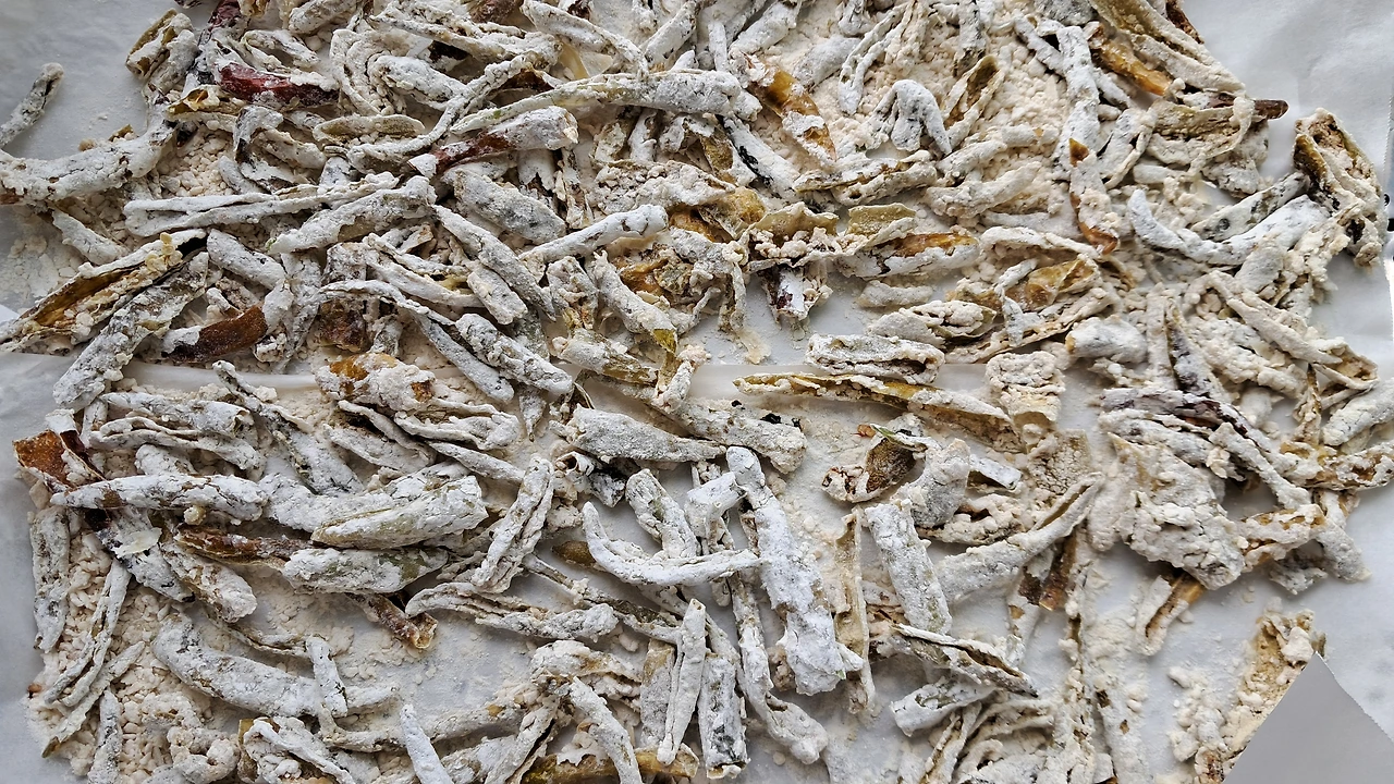 어렸을 때 추억의 음식인 바삭바삭 고추부각을 말려보았다.