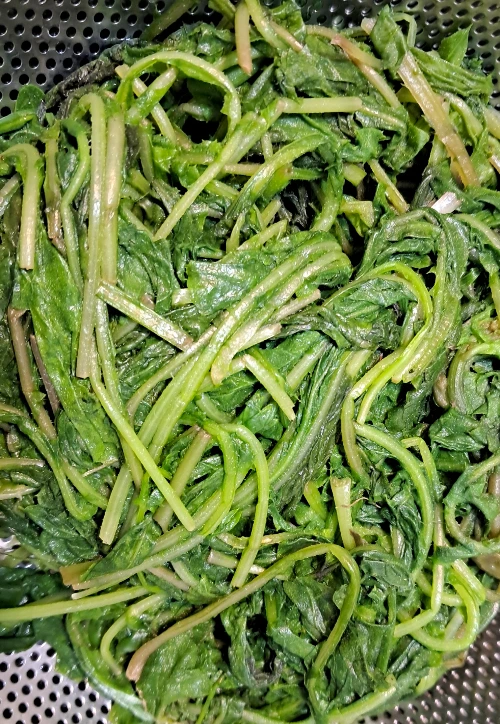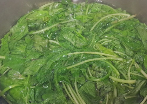 2) 끓는 물에 소금을 넣고 뽀리뱅이를 넣고 데친다.