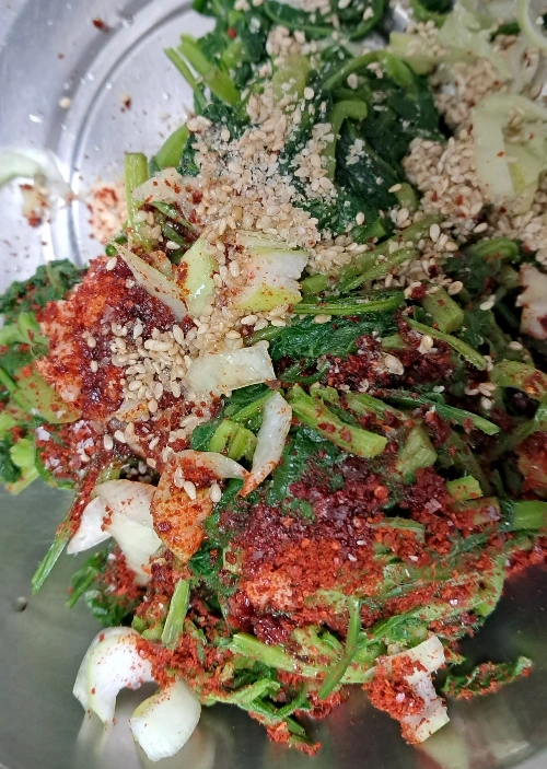 3) 대파, 다진 마늘, 고춧가루, 고추장, 매실액, 참기름(들기름), 까나리액젓 마지막으로 깨를 갈아서 넣었다.