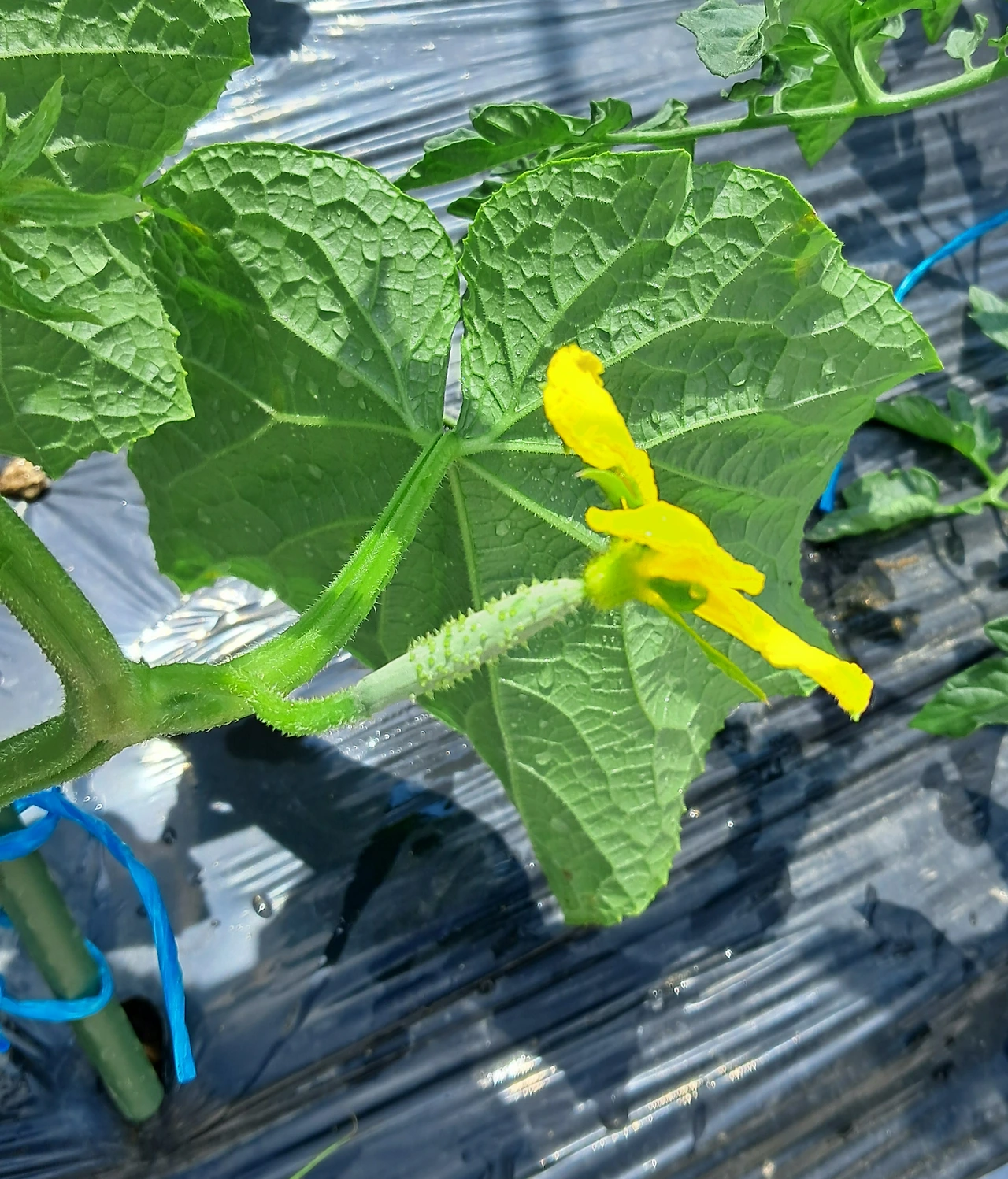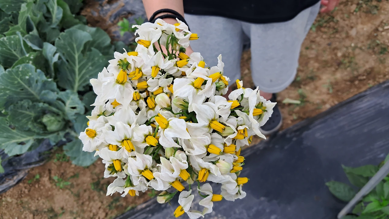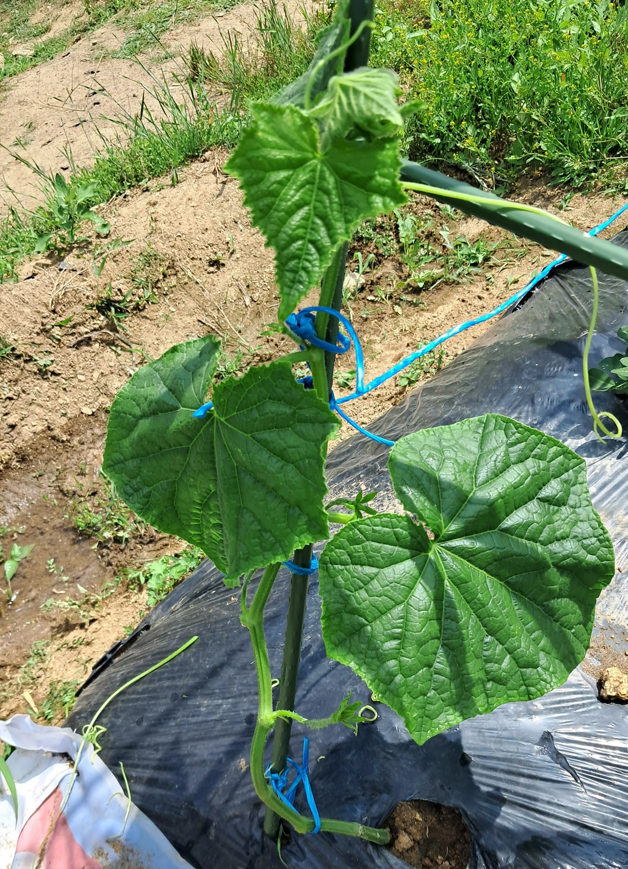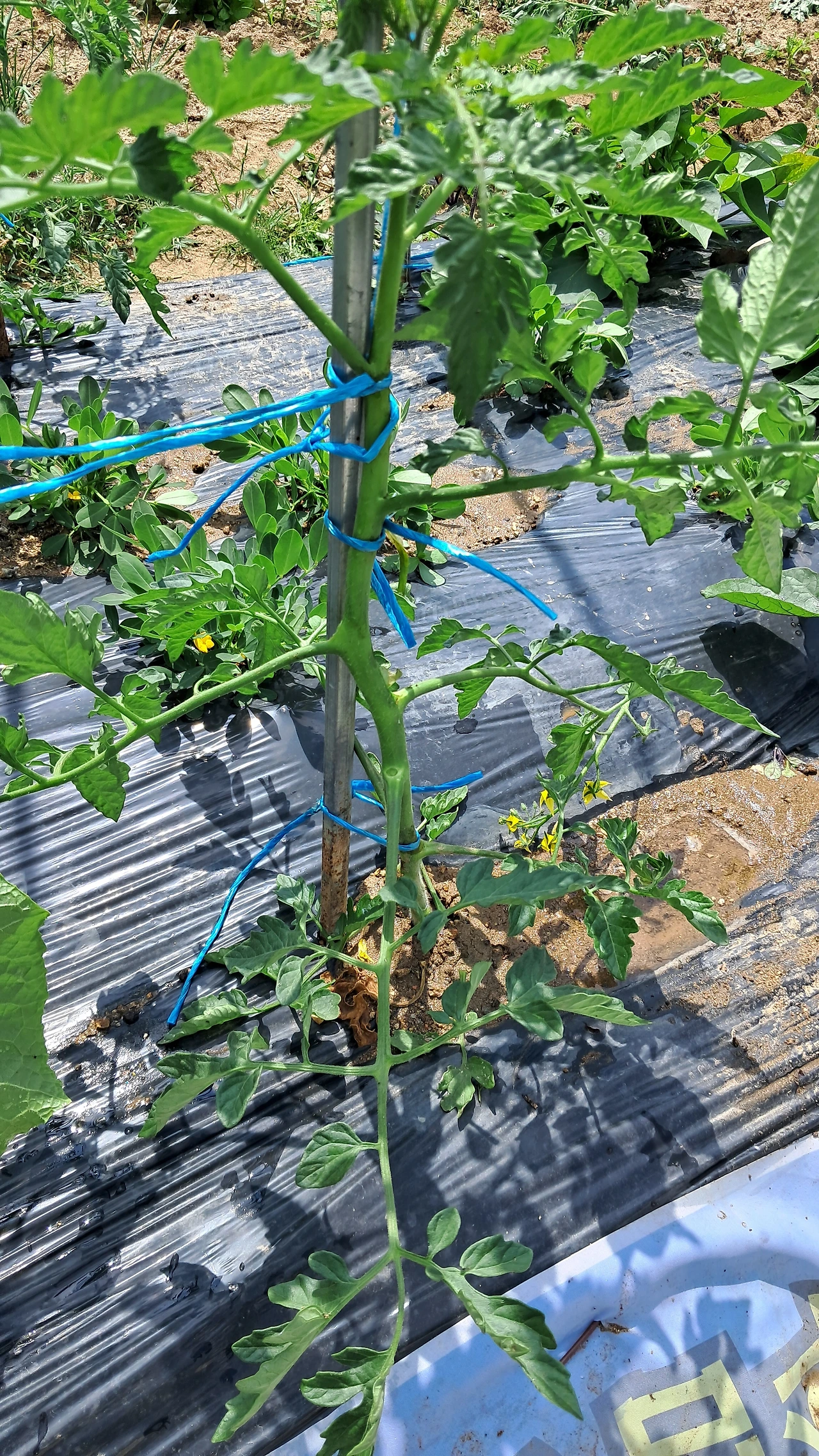 아들은 Y자 방아다리 줄기 아랫부분의 잎과 곁순 전부 제거하기, 딸은 감자꽃 따주고 물 주기, 남편은 서울 시댁에 가져다 드릴 잎채소 수확하기, 나는 호박, 오이, 토마토의 어미줄기만 남기고 곁순 제거하고 지지대에 묶어주기 작업을 했다.