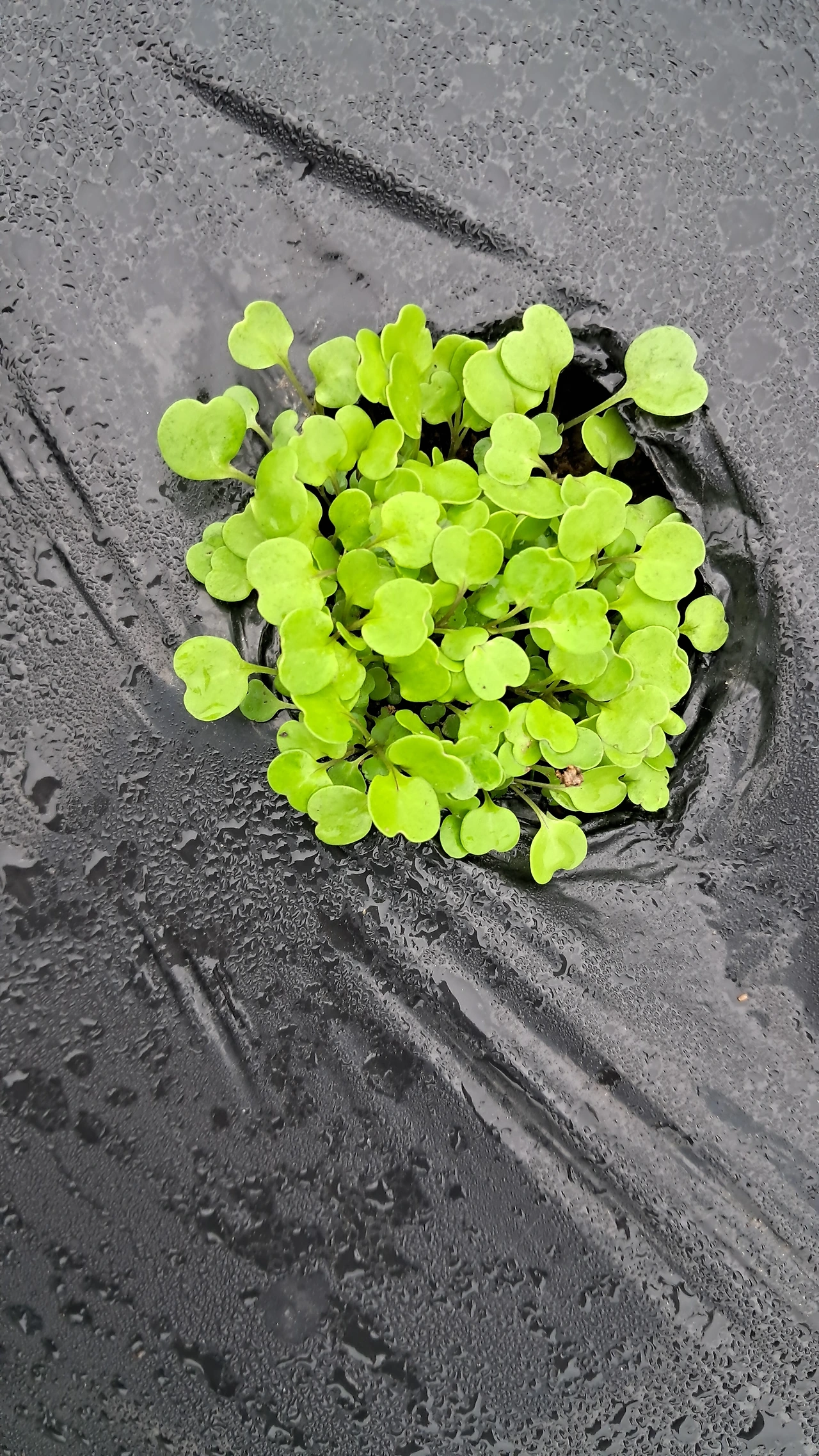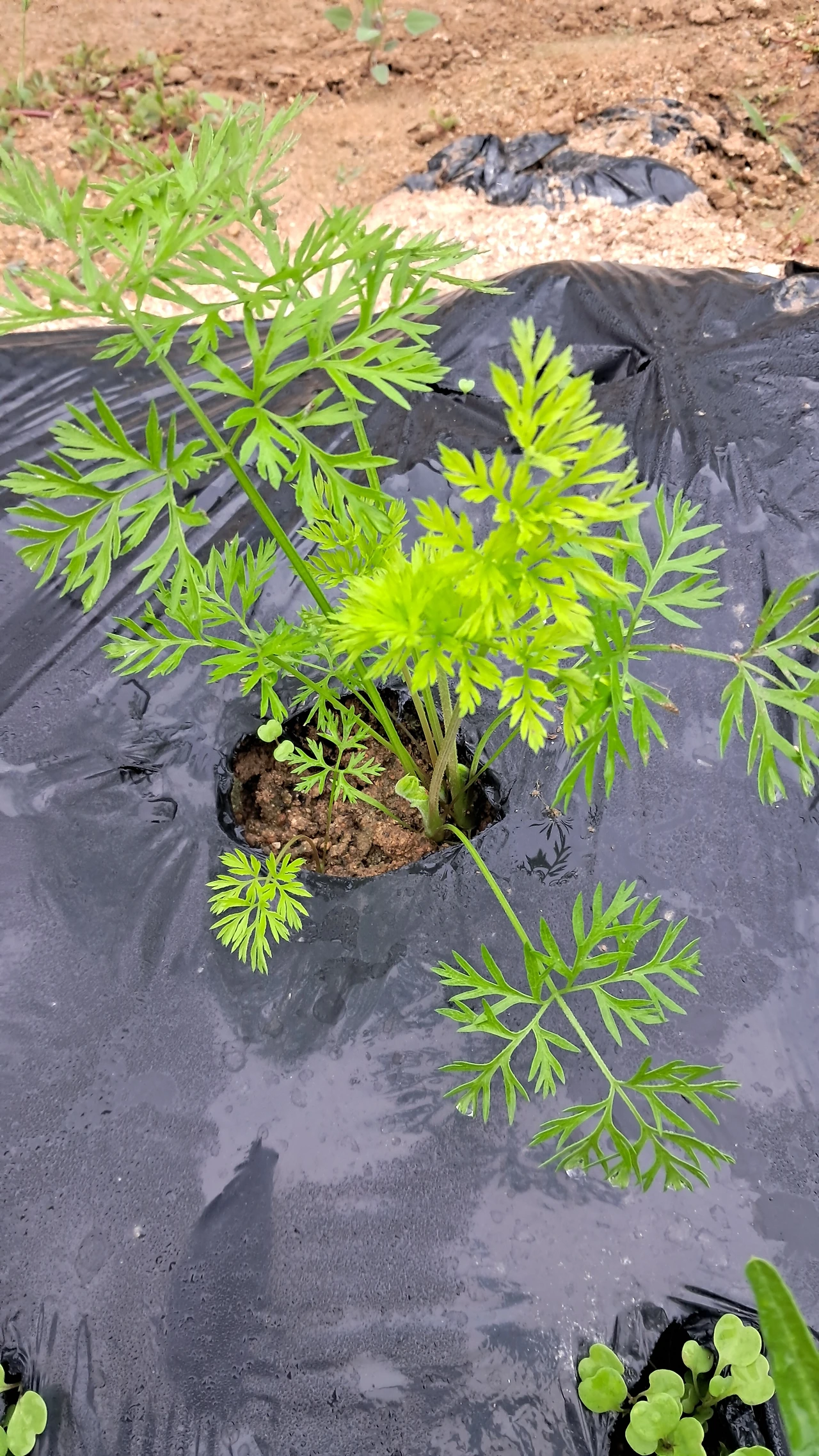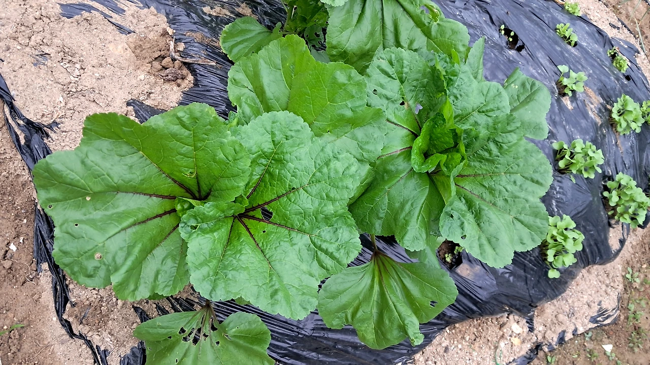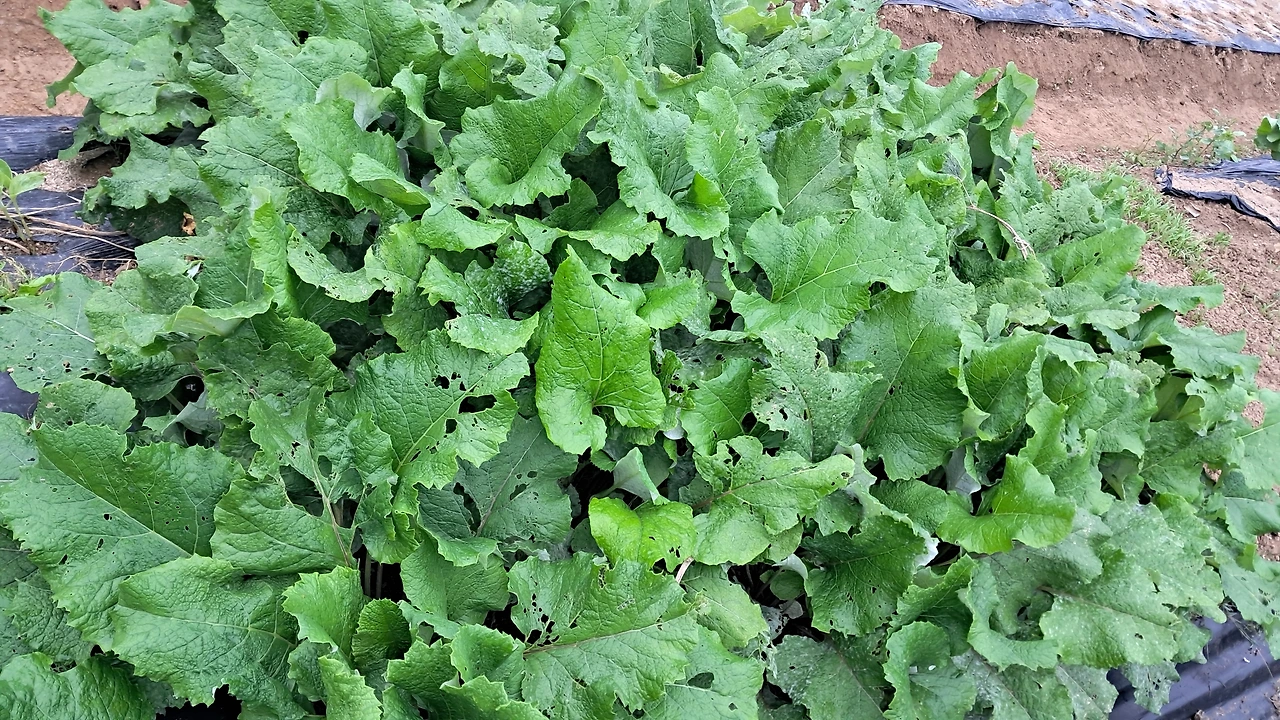4. 루꼴라 : 다 자란 것 뽑아주되 여린 것은 남겨두기. 새로 발아된 새싹 주변 비닐 찢어주기. 너무 빽빽하게 자란 새싹은 가운데를 솎아주기