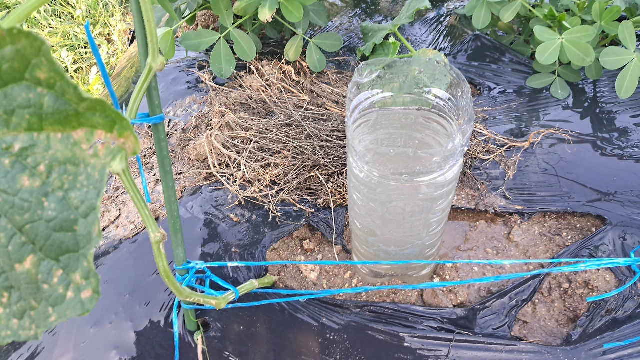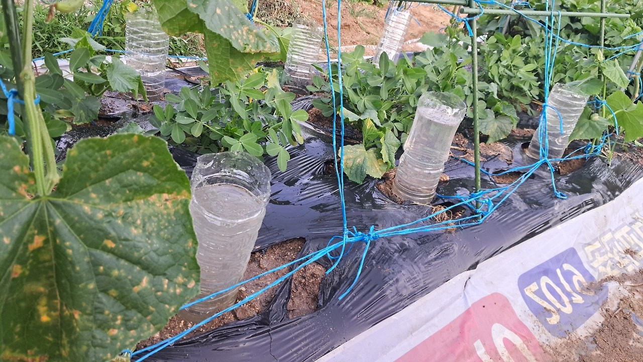 관수, 즉 텃밭 작물에 물을 대는 시설을 만들었다. 주말에 아파트 재활용 쓰레기장에서 주워놓은 페트병의 밑면을 자르고, 오이와 애호박 모종 사이에 거꾸로 묻었다. 텃밭을 떠나기 직전, 페트병에 물을 한가득 채워놓으면 관수시설 끝이다. 출근해 있는 동안, 페트병의 물이 자동으로 쫄쫄쫄~ 소량씩 내려가며 식물에게 수분을 공급한다. 유튜브에서 배웠다.