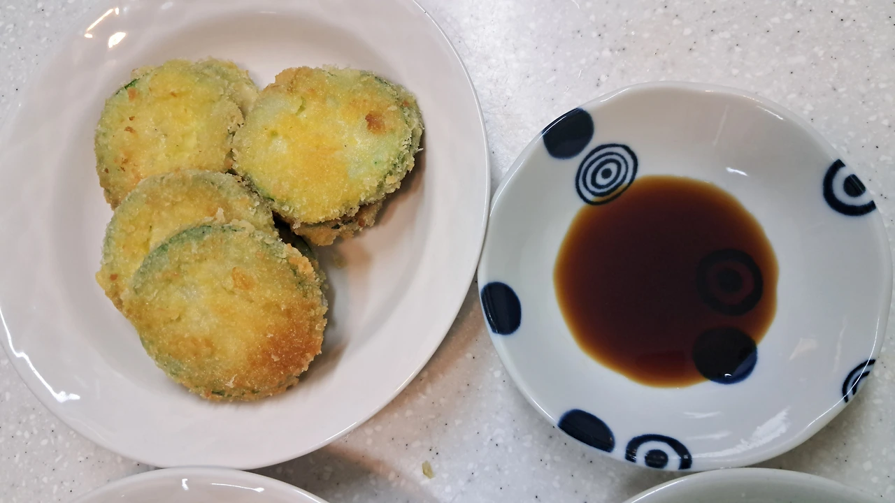 절여진 애호박은 채반에 올려 물기를 뺐다. 계란물에 담갔다가 빵가루를 입혀 팬에 노릇하게 부쳤다. 빵가루가 빨리 갈색으로 변하는 듯 해서 불을 줄였다. 레시피엔 계란 2개면 충분하다고 했지만, 괜히 고집 피워 3개를 풀었다. 역시 계란물이 꽤 남는다. 찍어먹는 소스도 레시피 설명대로 만들었다. 물 1스푼, 진간장 1스푼, 식초, 1/2스푼, 설탕 1/4스푼. 맛을 보니, 무엇에 찍어먹어도 맛있을 간장 소스맛이다.