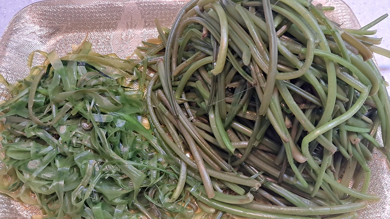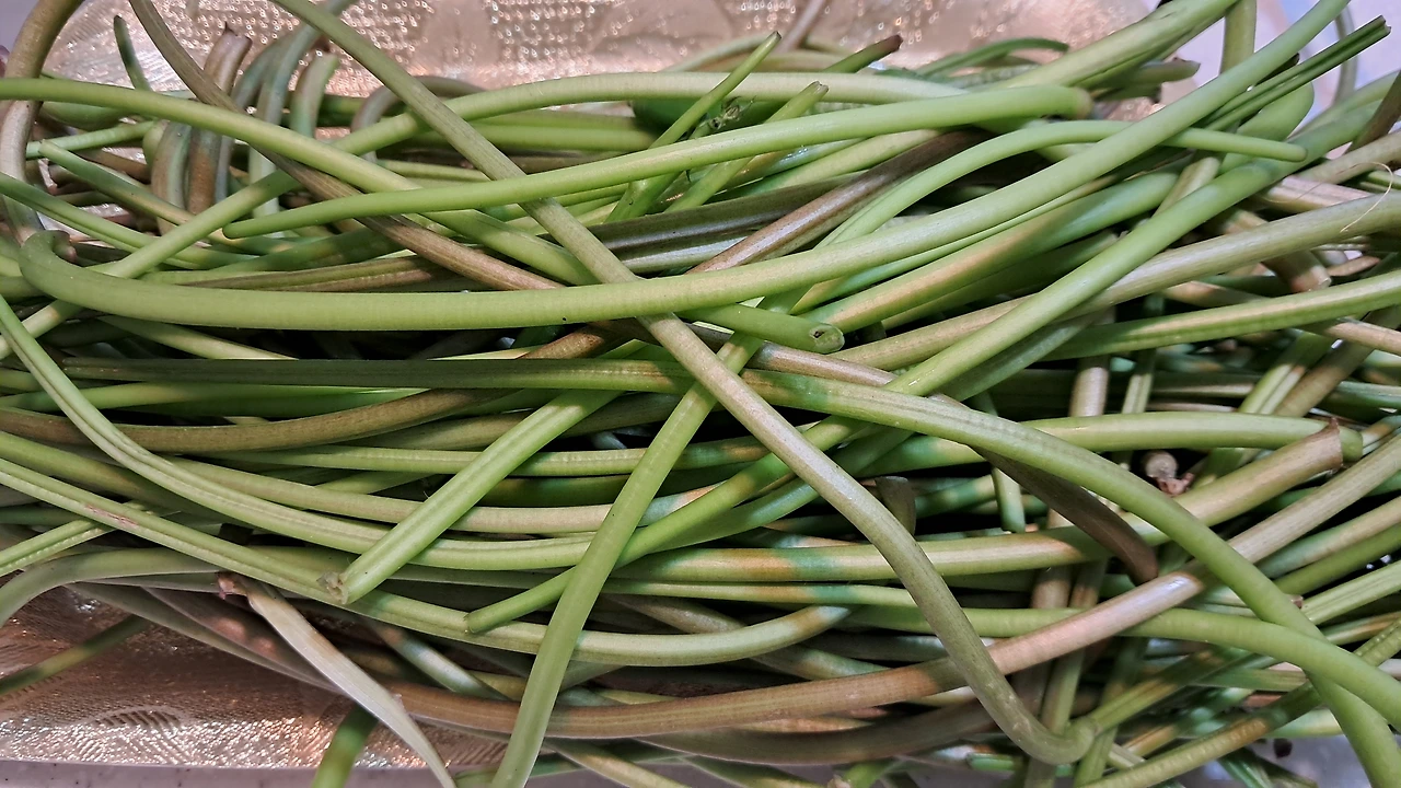 고구마 줄기, 아주 연하고 실하게 잘 자라 있었다. 껍질이 1차 벗겨지도록 머리 부분을 꺾어 내렸다. 끓는 물에 소금을 조금 넣고 10초간 데친 후, 재빨리 찬물에 헹궈 식혔다. 고구마순을 2등분으로 자르며 껍질을 벗겼다. 껍질이 매우 잘 벗겨졌지만, 직장맘이 자주 해먹을 건 아니라는 생각이 들었다. 쪽파 다듬는 것보다 시간 소요가 많이 된다.