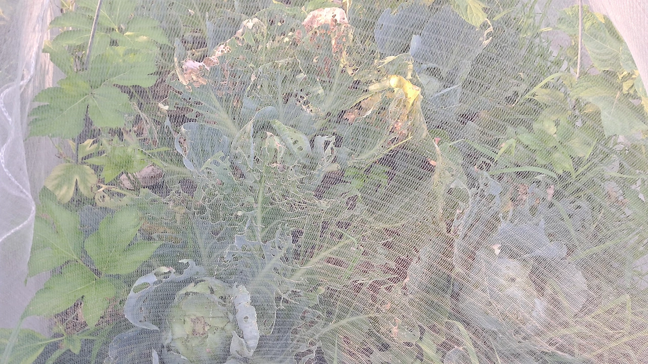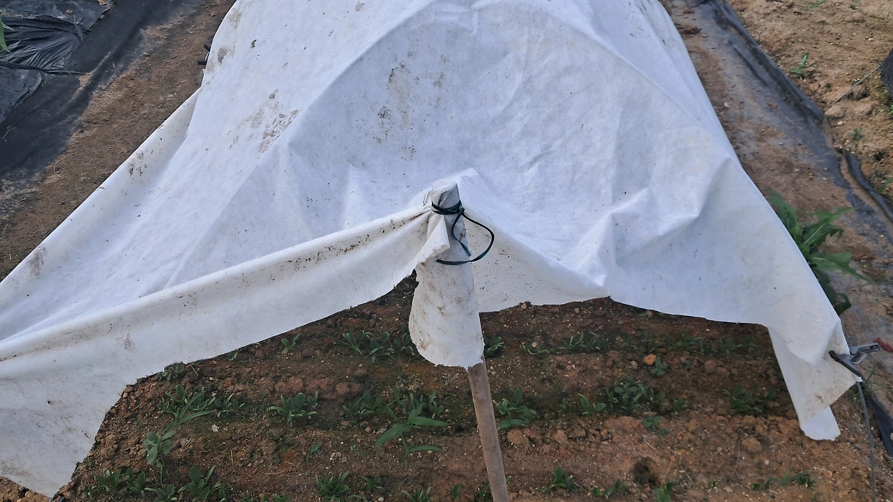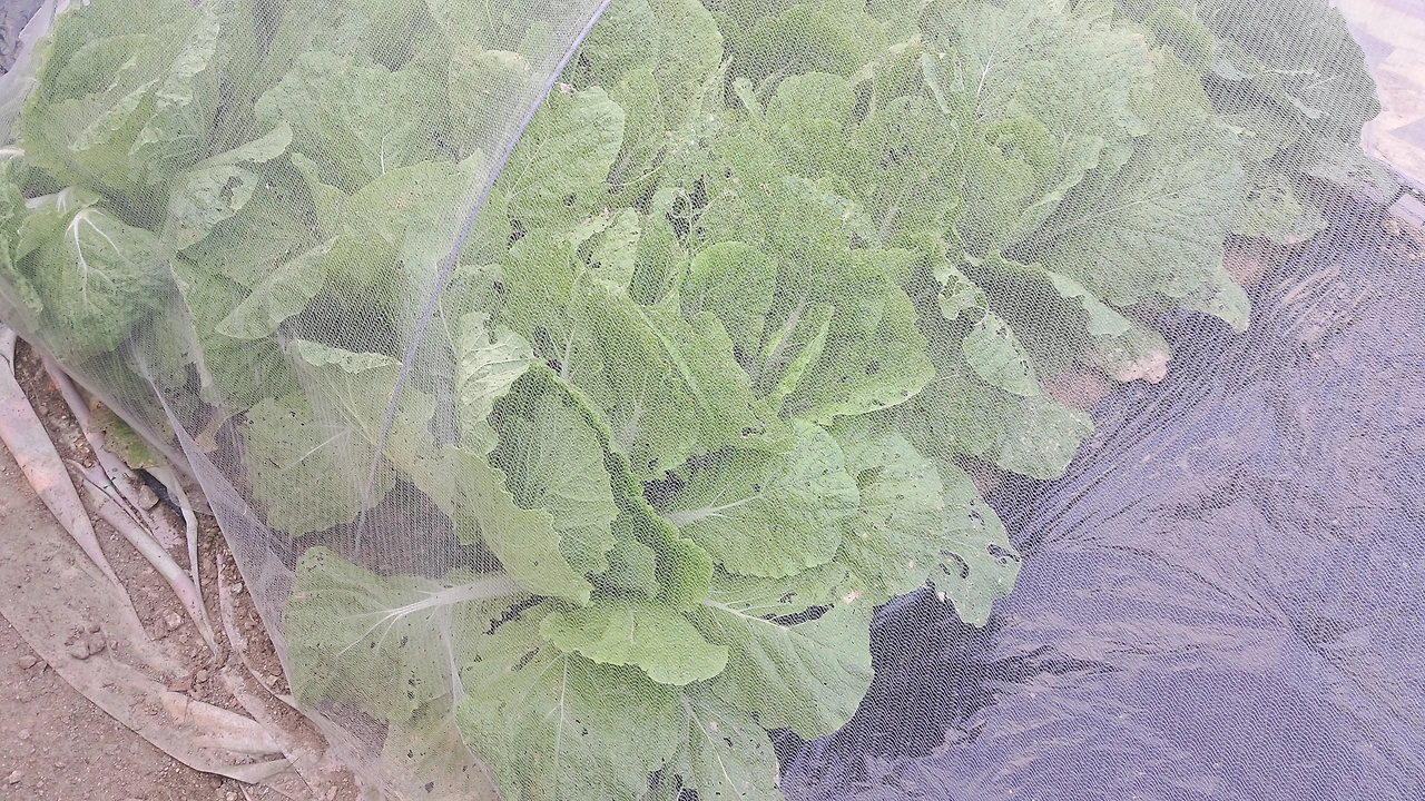 병충해 방지를 위해 한랭사를 덮고 열무, 청경채, 양배추 심기