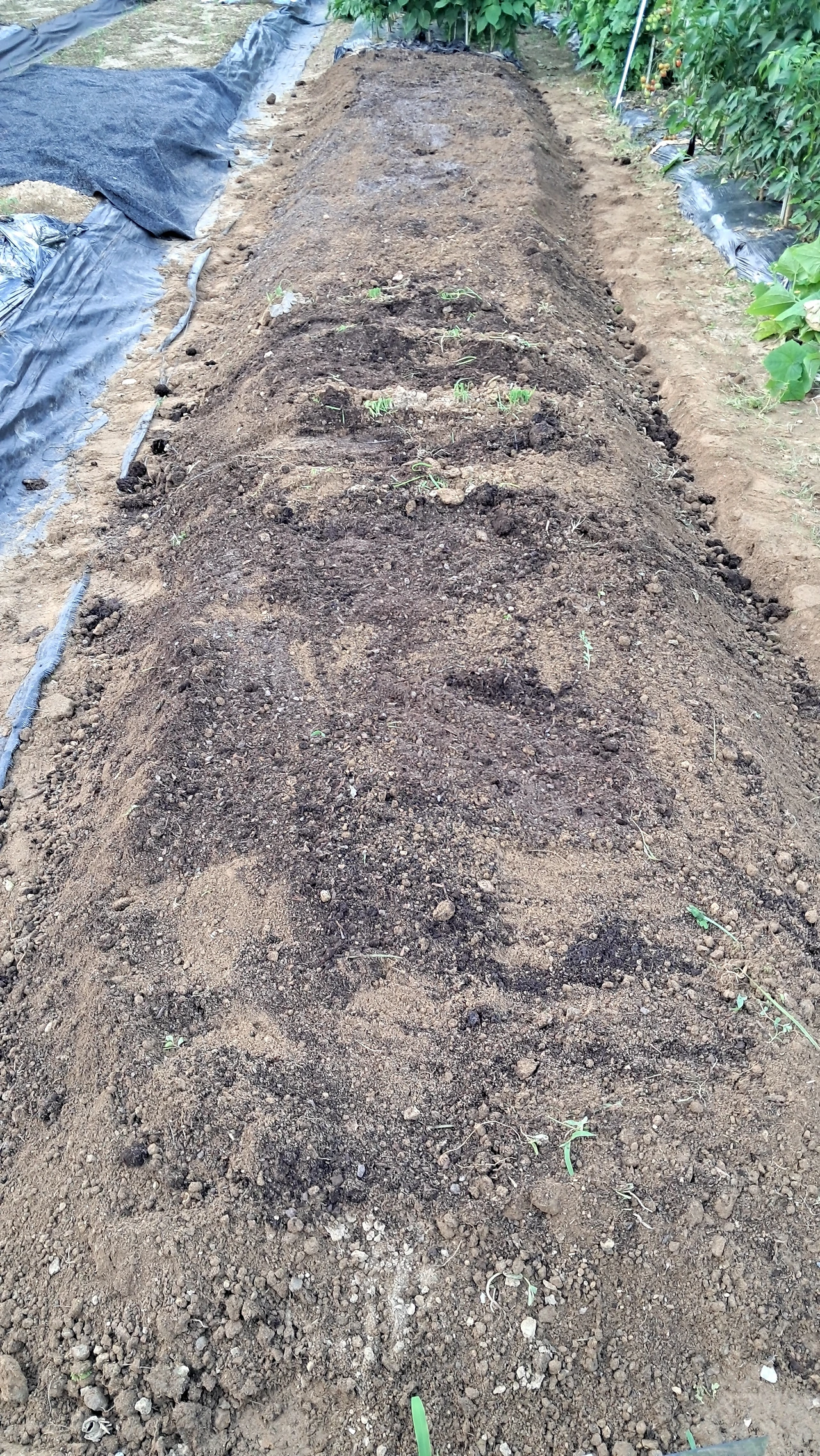 퇴비포대를 개봉하여 거꾸로 잡고 직선으로 뒷걸음질 치며 두둑 중앙에 퇴비를 쏟는다. 10지창 도구로 슬슬슬~ 퇴비를 고르게 펴 바른다. 마치 식빵 위에 쨈을 바르듯. 한 치의 오차 없이 수직이 맞는지 바로 잡아본다. 이제 3일간 퇴비의 가스가 빠지기를 기다려 비닐멀칭을 할 예정이다. 핀으로 꼽는 방식이기에 그 작업도 큰 수고로움 없이 혼자 가능하다.