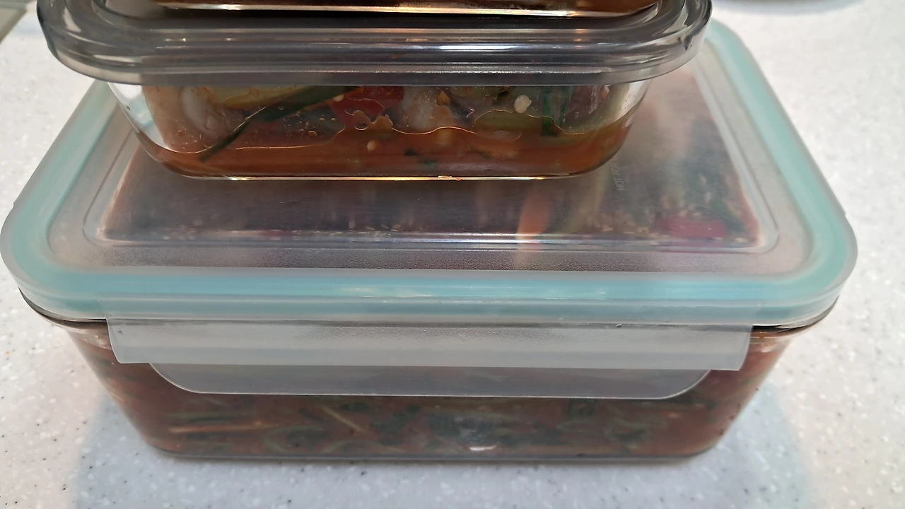 올해 5월에 시어머님께 열무김치 만드는 법을 배웠었다. 그때 설명해 주신 것처럼 용기에 김치를 담을 때 모서리 공간이 남지 않도록 꾹꾹 눌러 담았다. 마늘을 넣으면 군내가 나지 않는다는 말씀도 머릿속에 강하게 박혀있다.