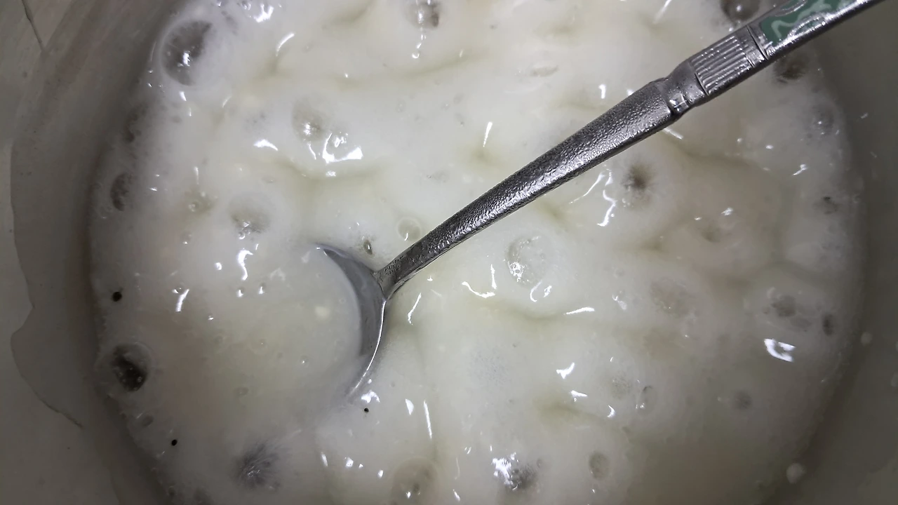 1. 밀가루 1스푼+ 물 1컵 반을 넣고 밀가루 풀을 만든다.(약불에 저어가며)