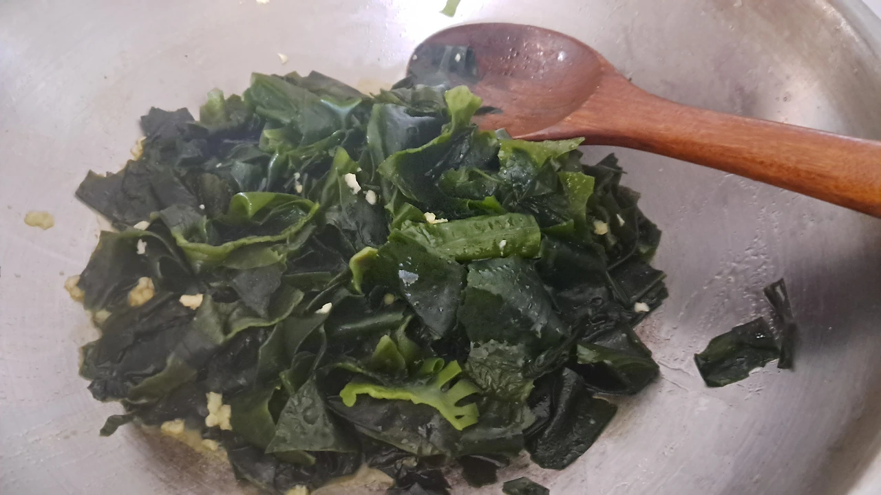 (4) 만들어놨던 육수에 볶은 미역을 넣는다.