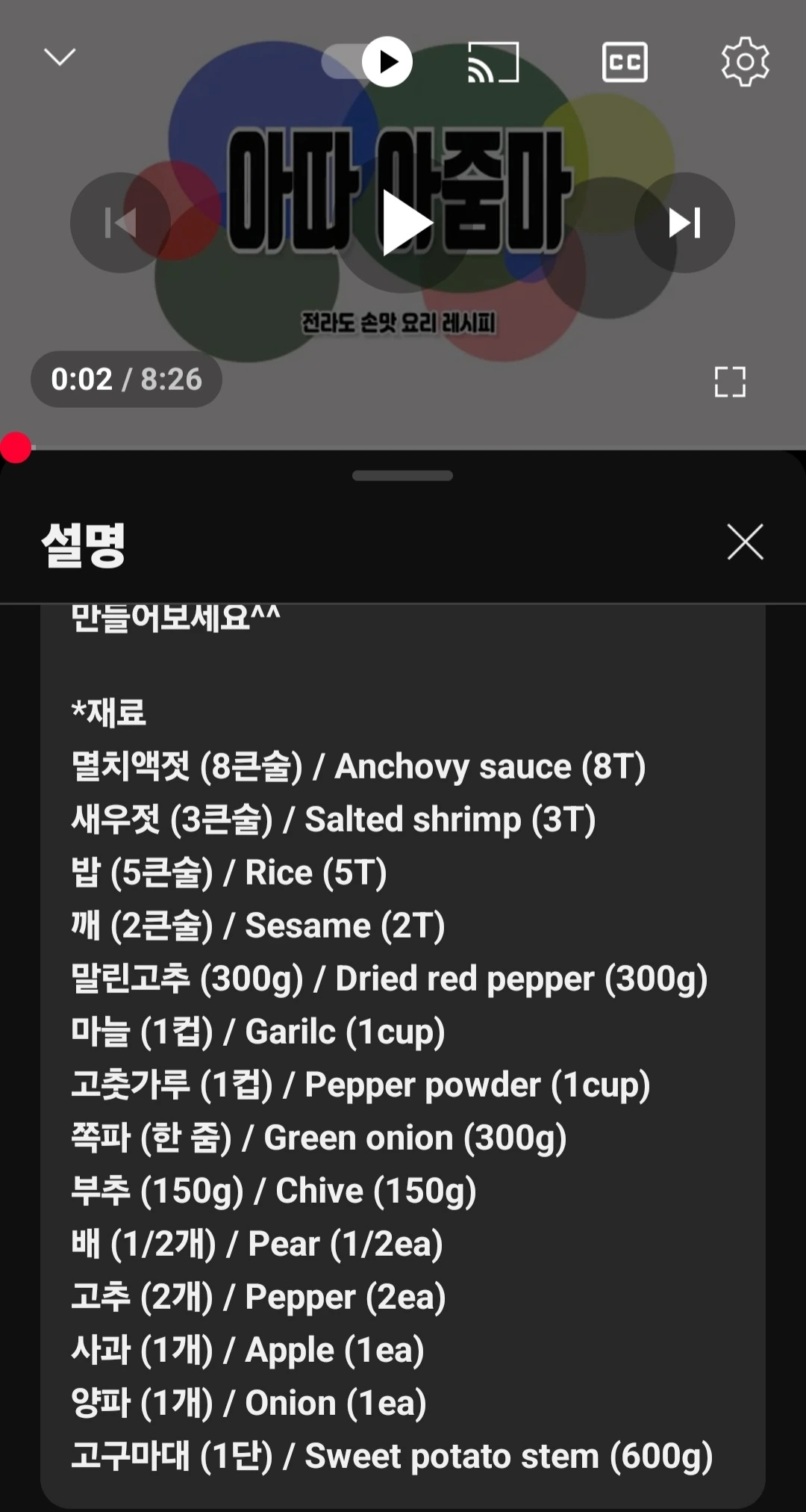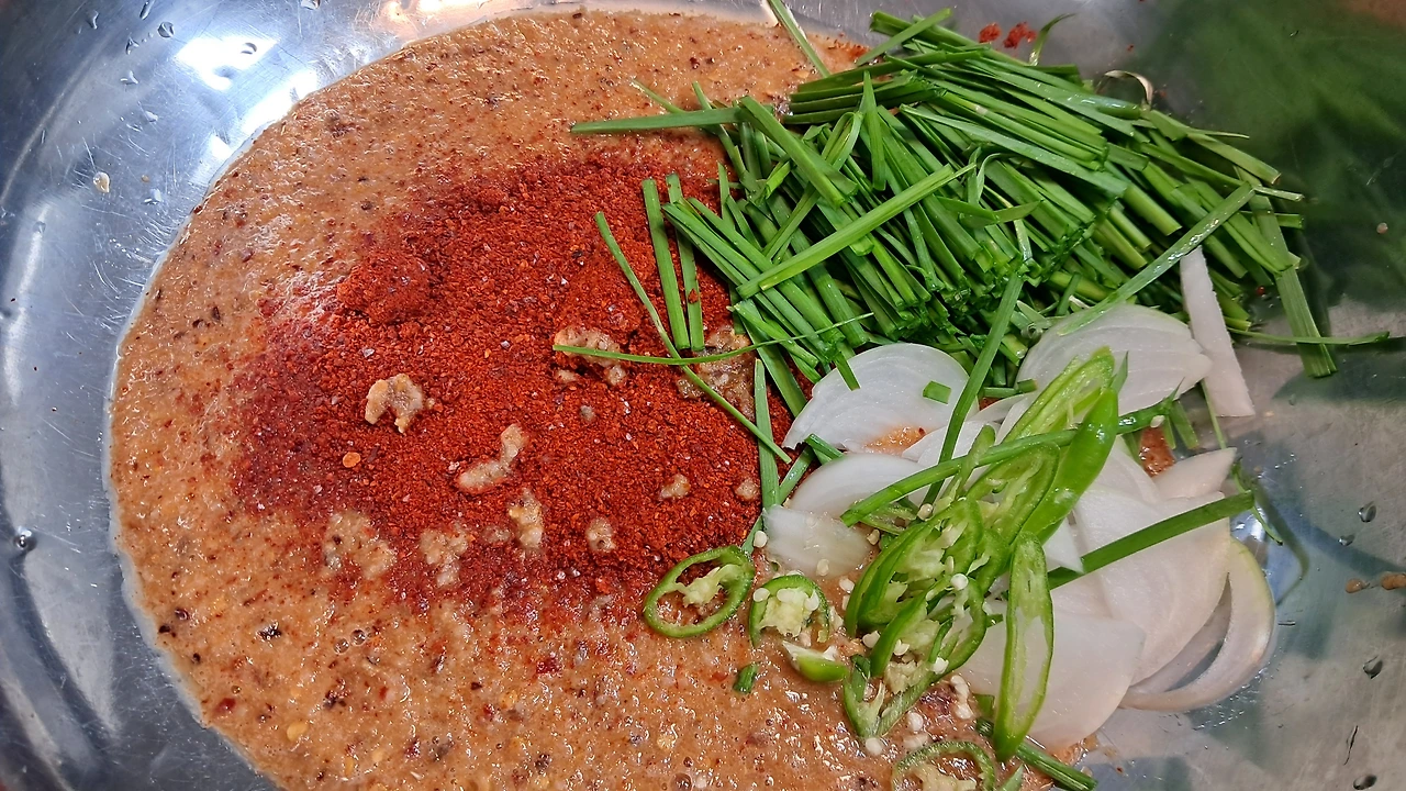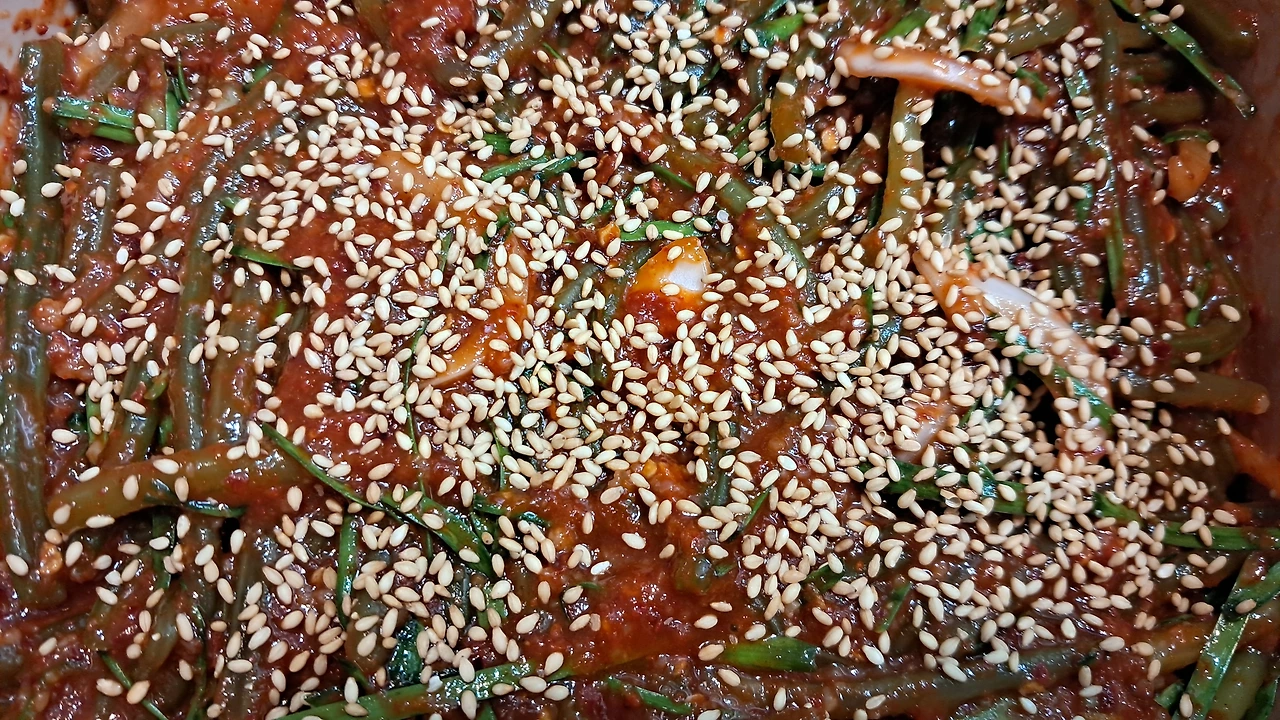 '아따 할매'의 레시피를 그대로 따라 하려 노력했으나, 파가 없어 고추 한 개를 아주 얇게 어슷 썬 걸로 대체했다. 고추가루 1컵을 넣으라고 했으나, 3/4컵만 넣어본다. 그리고 배, 사과를 추가하라고 했으나 설탕 3스푼으로 대체해본다.