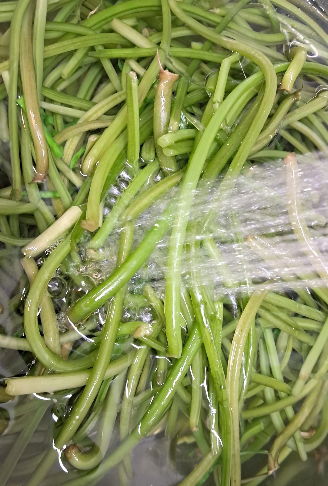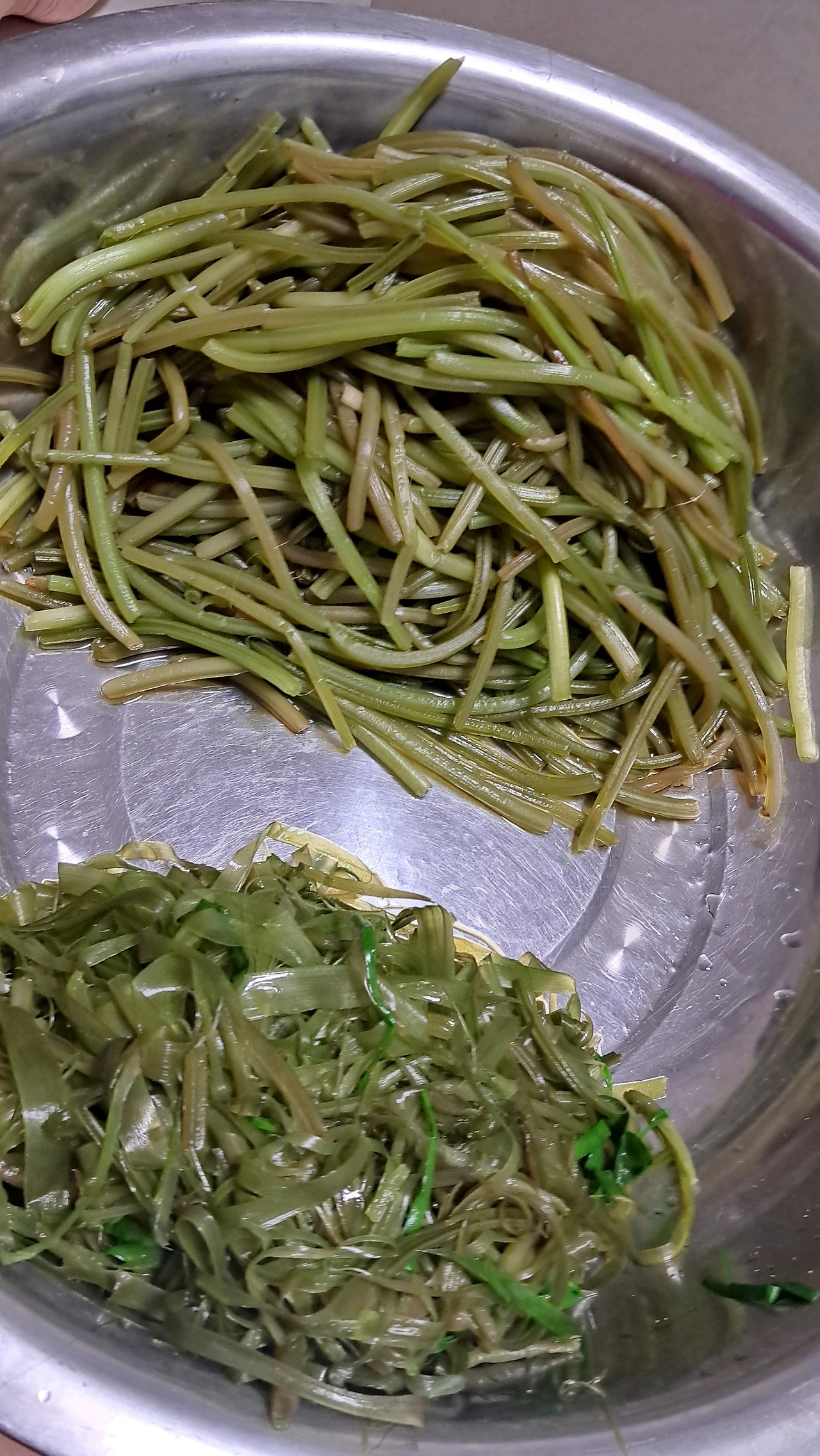 나) 끓는 물에 소금 넣고 고구마줄기를 넣어 짧게 데쳐 찬물에 헹구기. 찬물에 5분 정도 담가 놓기