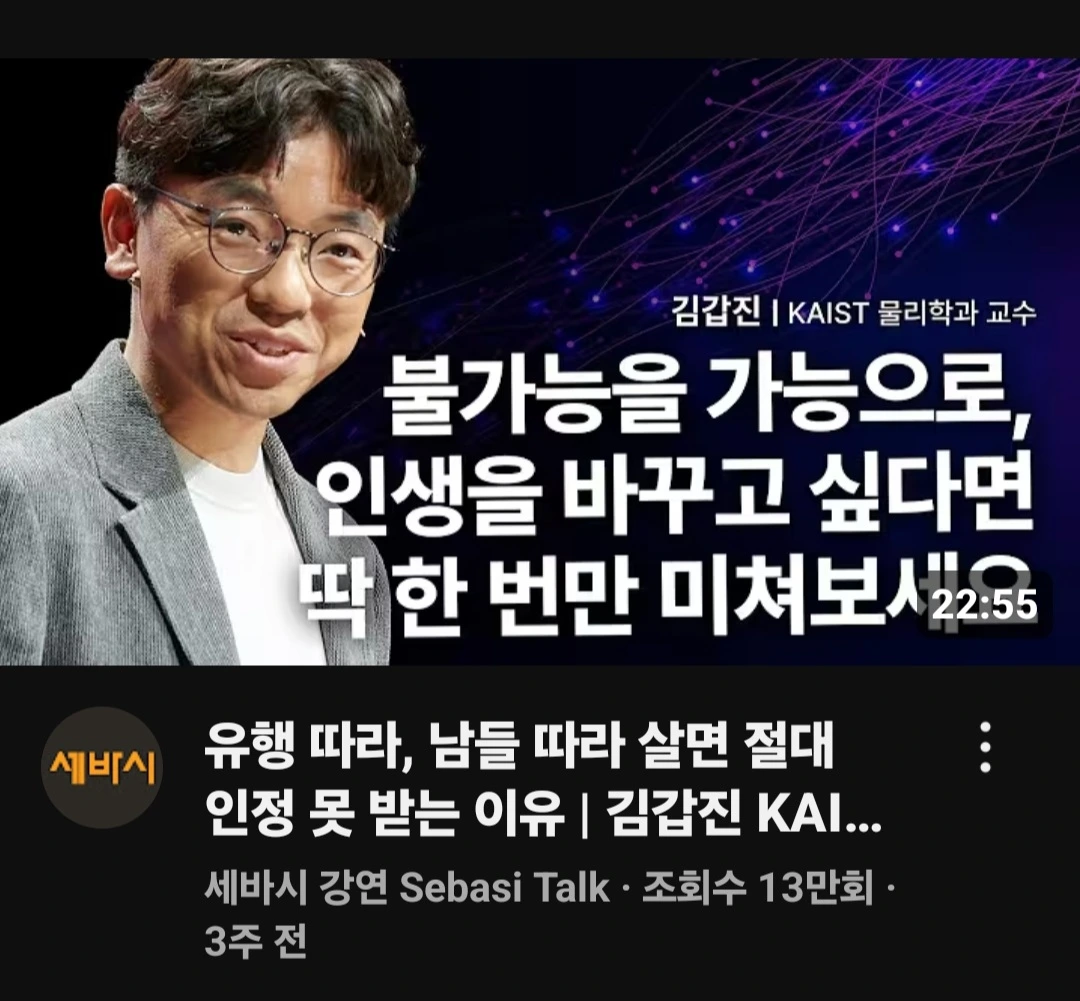 소금물에 고구마순을 데쳐 껍질을 벗기는 동안 TV로 유튜브 세 편을 봤다. 아마 '게으름, 무기력' 등으로 검색어를 넣어 찾은 영상들일 것이다. 세 편 모두 나를 위한 특강 같았다. 뇌과학자 장동선 박사의 '내 인생이 꼬였을 때 오히려 좋은 이유', KAIST 물리학과 김갑진 교수의 '불가능을 가능으로, 인생을 바꾸고 싶다면 딱 한 번만 미쳐보세요', 윤홍균 정신건강의학과 전문의의 '정신과 의사가 강력하게 제안하는 100% 성공하는 법'을 보았다.