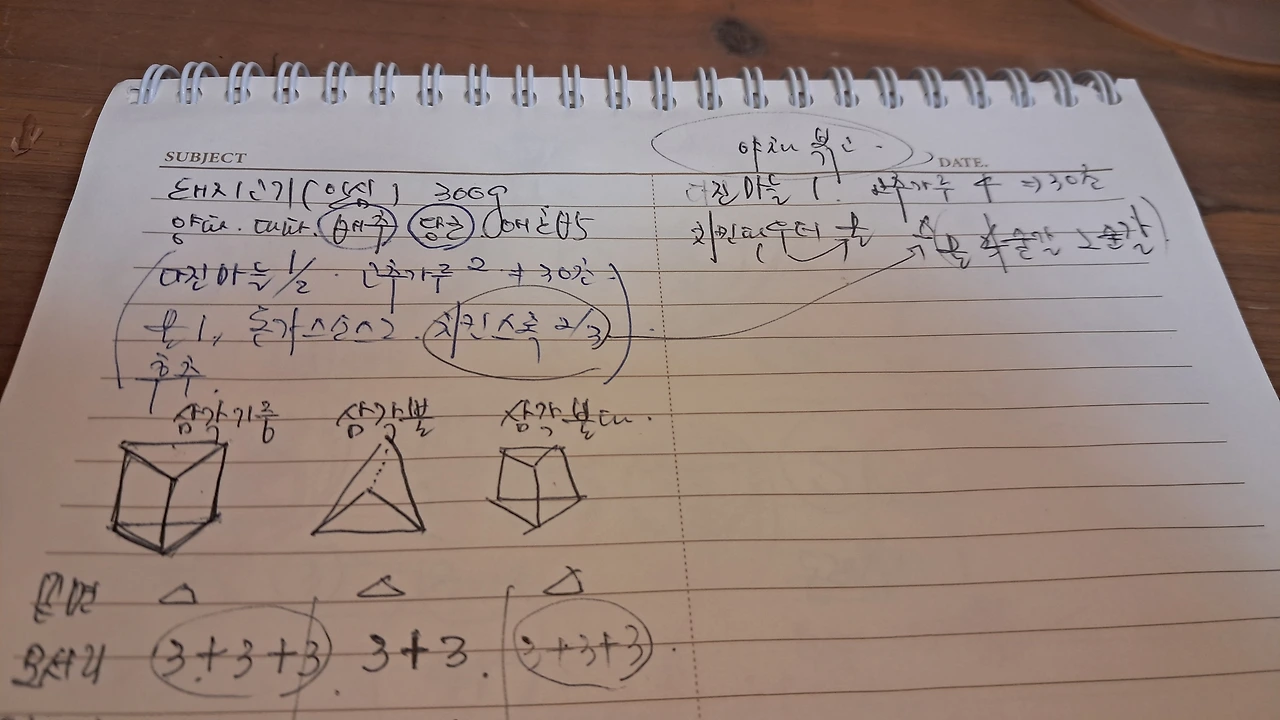 40대가 되면서 우울증이 왔나 싶었는데, 애들 때문에 시작한 공부가 이제 취미가 되었단다. 수학이 이렇게 재미있는 영역이었냐고 한다. 처음에는 달력 뒷면에 풀기 시작하더니, 이제는 엄연히 '아빠 꺼 수학노트'를 끼고 다닌다.