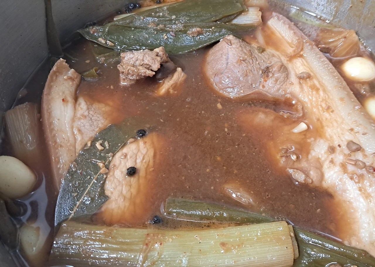 5) 고기를 다 건져내고 1차 익힌 육수에 쌍화탕 1병, 새로운 고기 1300g 넣고 2차 수육 만들어도 촉촉하고 맛있는 수육이 완성된다.