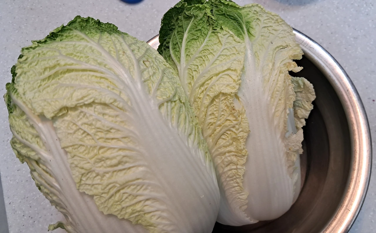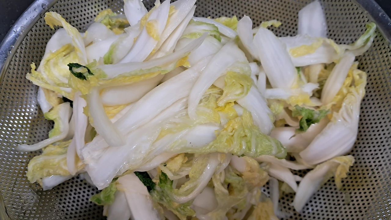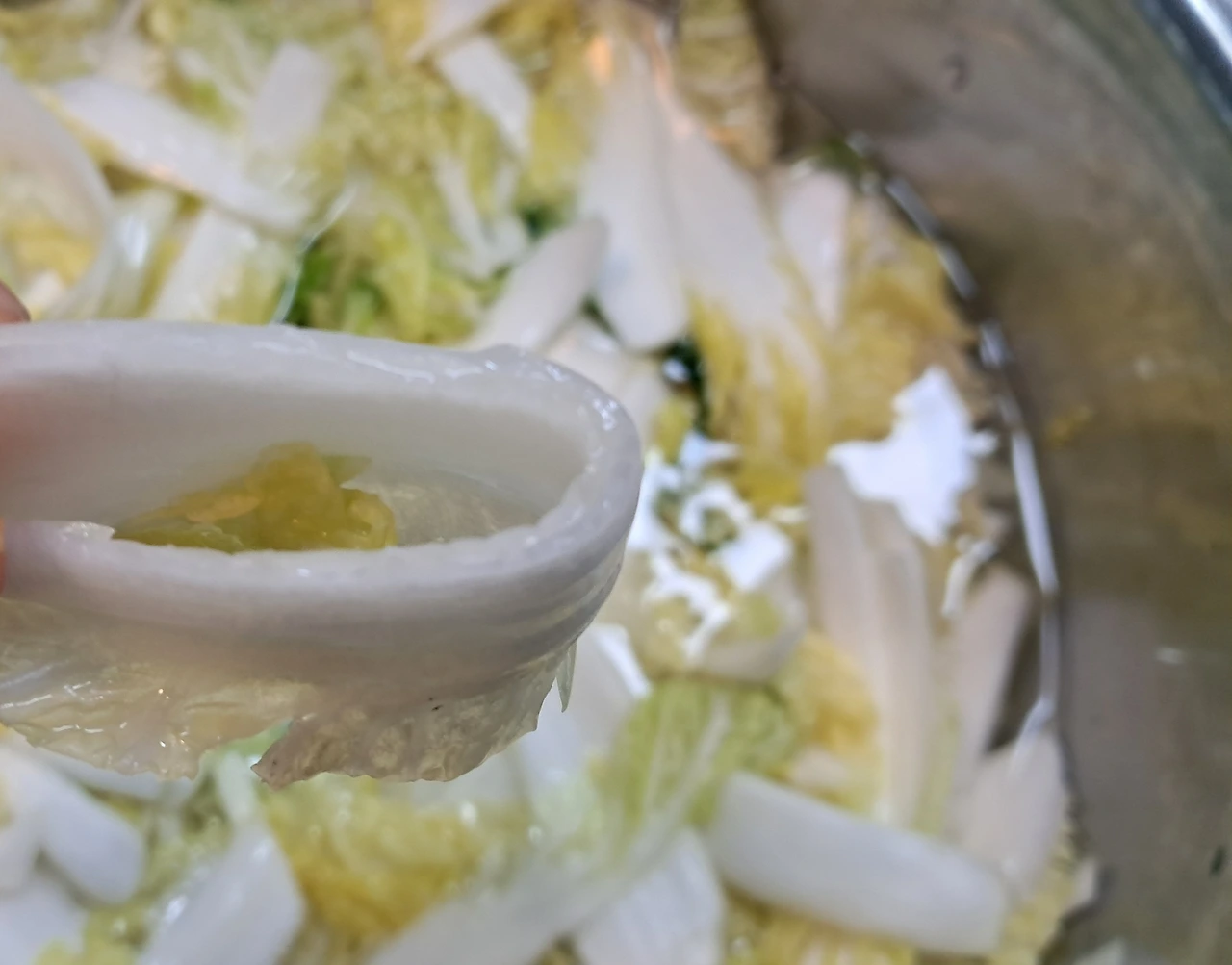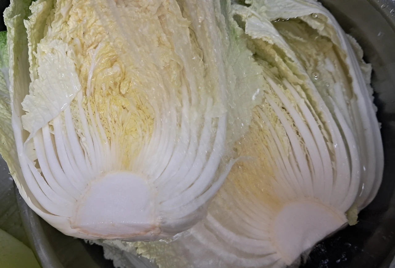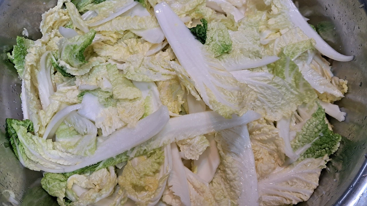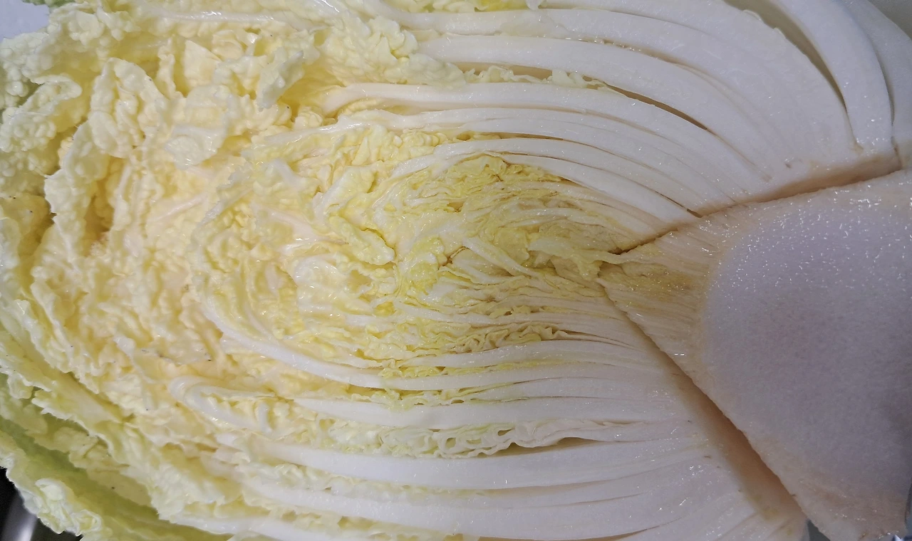 3) 1시간 정도 놔두면 알배추의 허리를 휘었을 때 폴더폰처럼 부드럽게 접어진다. 다 된 거다.