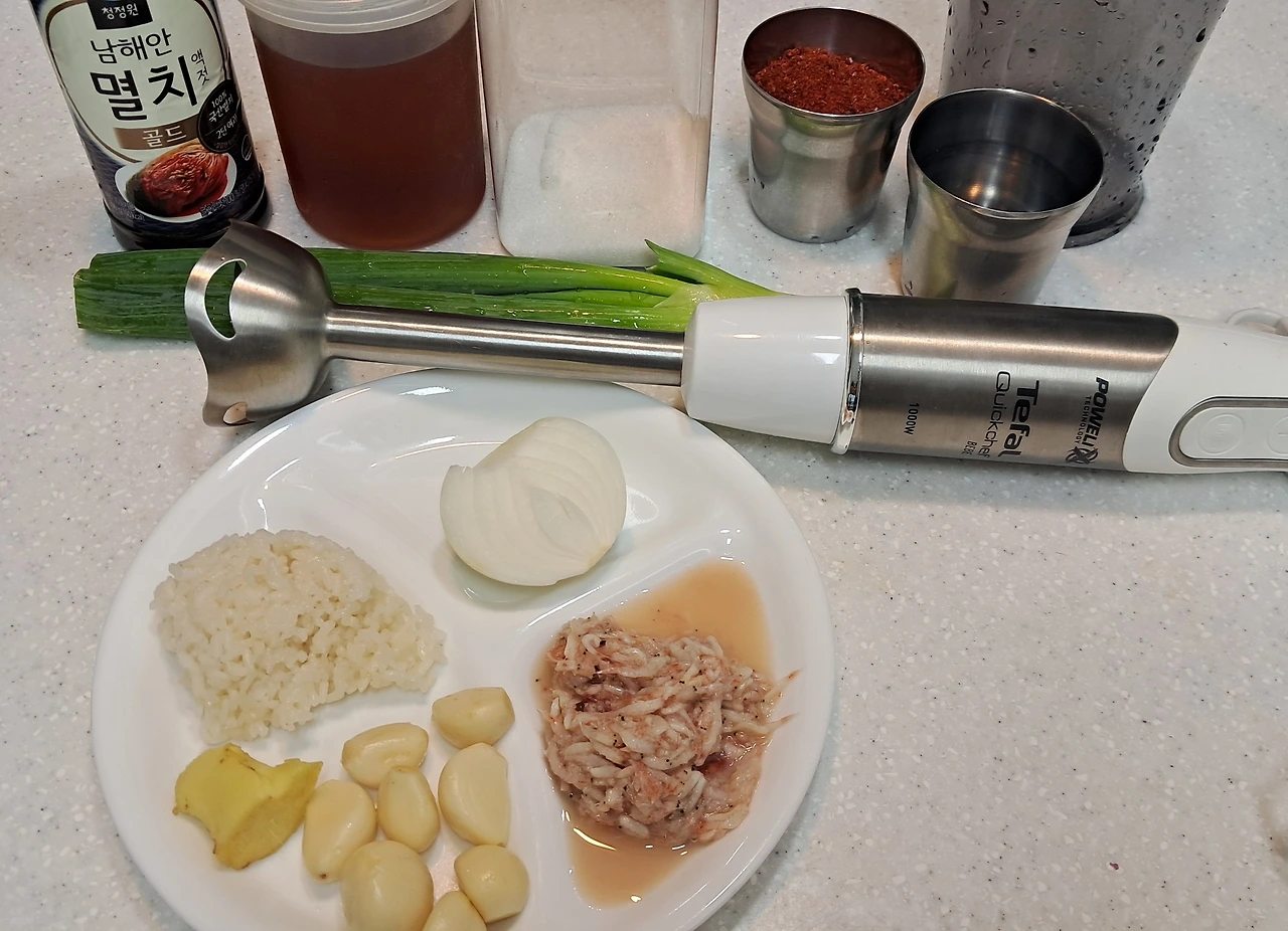 1) 핸드믹서에 (생강 작은 톨 1개, 밥 듬뿍 1스푼, 양파 1/4개, 새우젓 3T, 통마늘 8개, 멸치액젓 1/2컵) 넣고 갈기