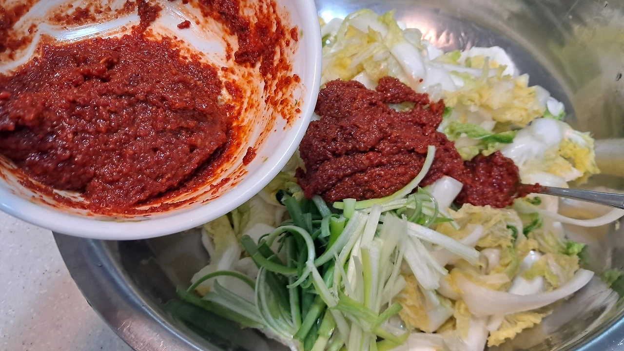 2) 갈아놓은 양념에 얇게 썬 대파와 알배추를 넣고 꾹꾹 누르며 버무리기