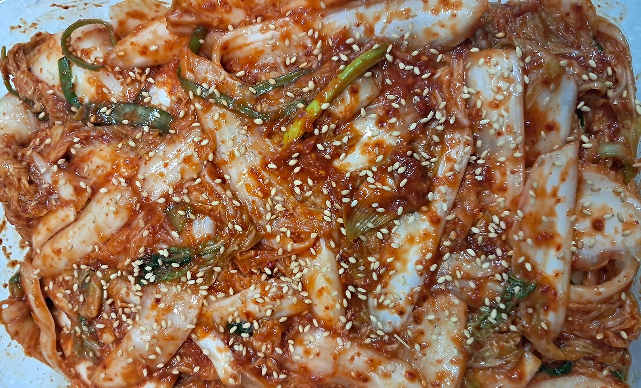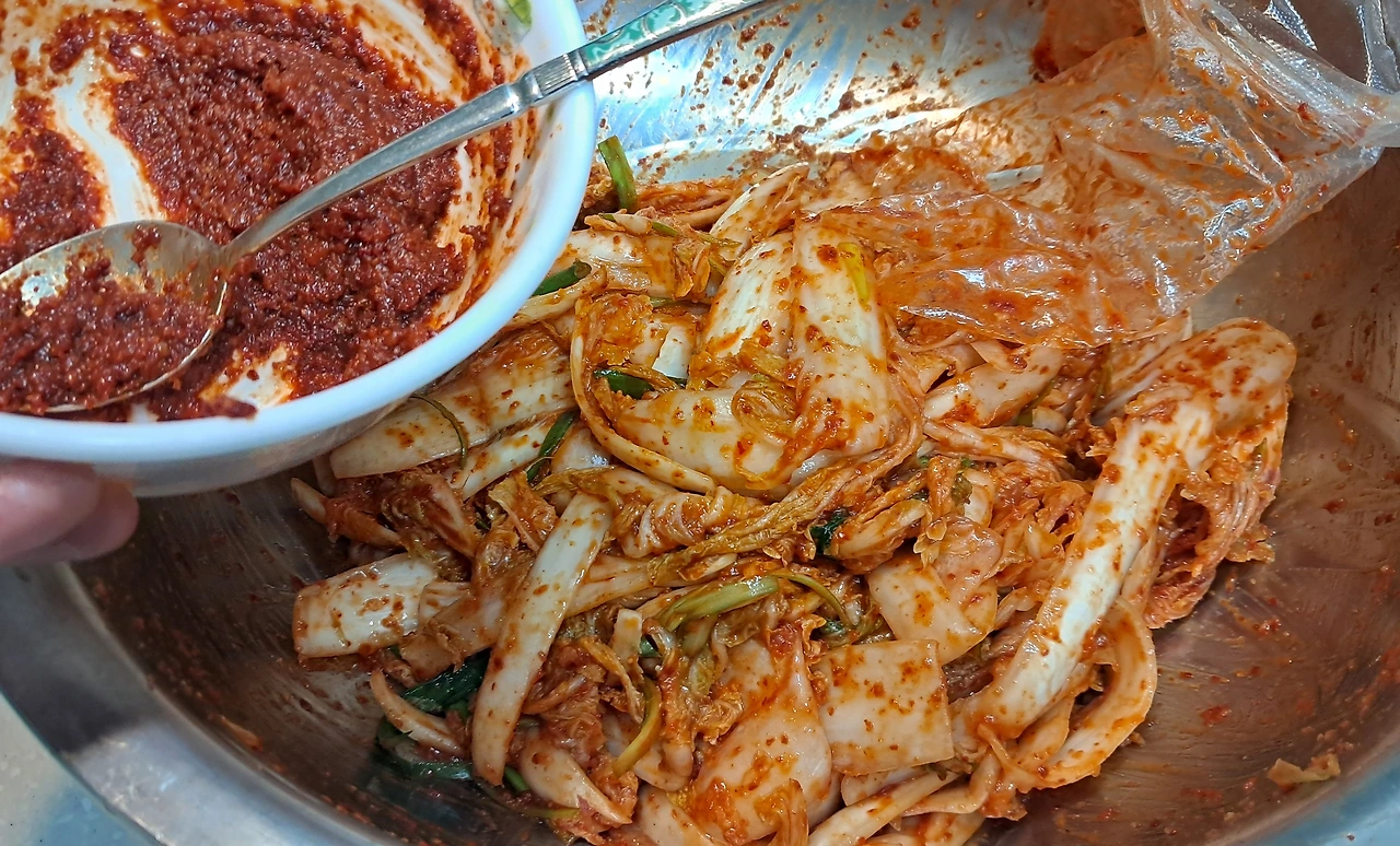 리꼬 채널의 유튜브 콘텐츠 제목에 " [한 가지] 과정만 거치면 맛이 끝내줘요!"라고 되어 있다. 두 번 집중해서 보고 그 한가지 과정이 무엇인지 예측해 본다. 아마 둘 중 하나일 것이다. 1) 고춧가루 등 양념을 배합하여 30분 이상 숙성 시켜 사용하기, 2) 버무릴 때 치대듯 버무리기. 실제 바로 양념을 배합하는 것보다, 시간이 흐를수록 고춧가루 색이 아주 곱게 변해갔다.