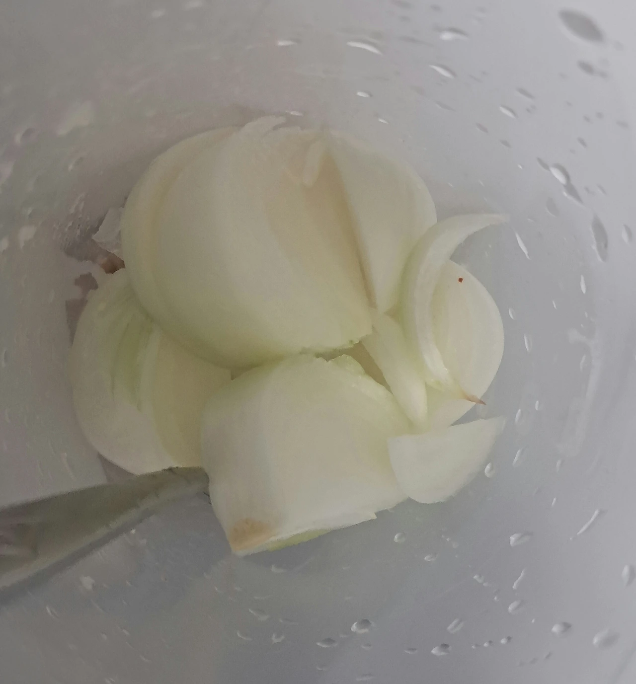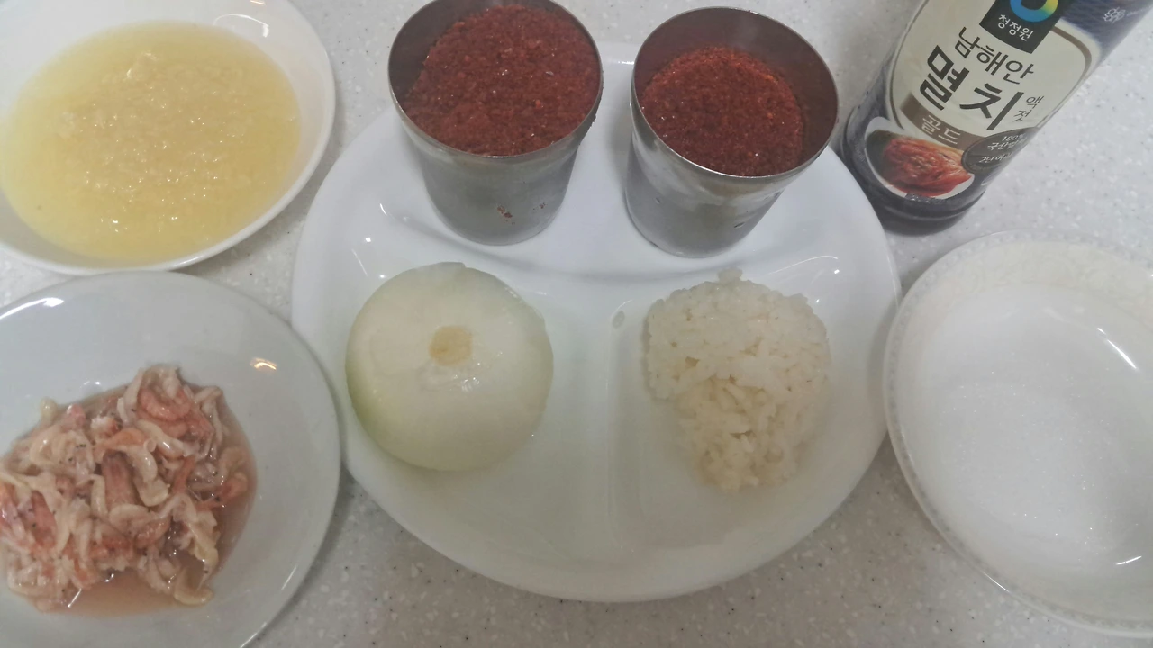 2. 핸드믹서로 밥 2스푼, 까나리 액젓 1컵, 새우젓 2스푼, 양파 1개를 갈고, 고춧가루 등 나머지 양념을 버무려 숙성시켜 놓는다.