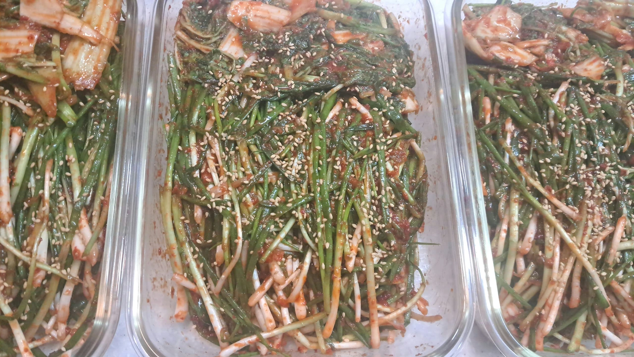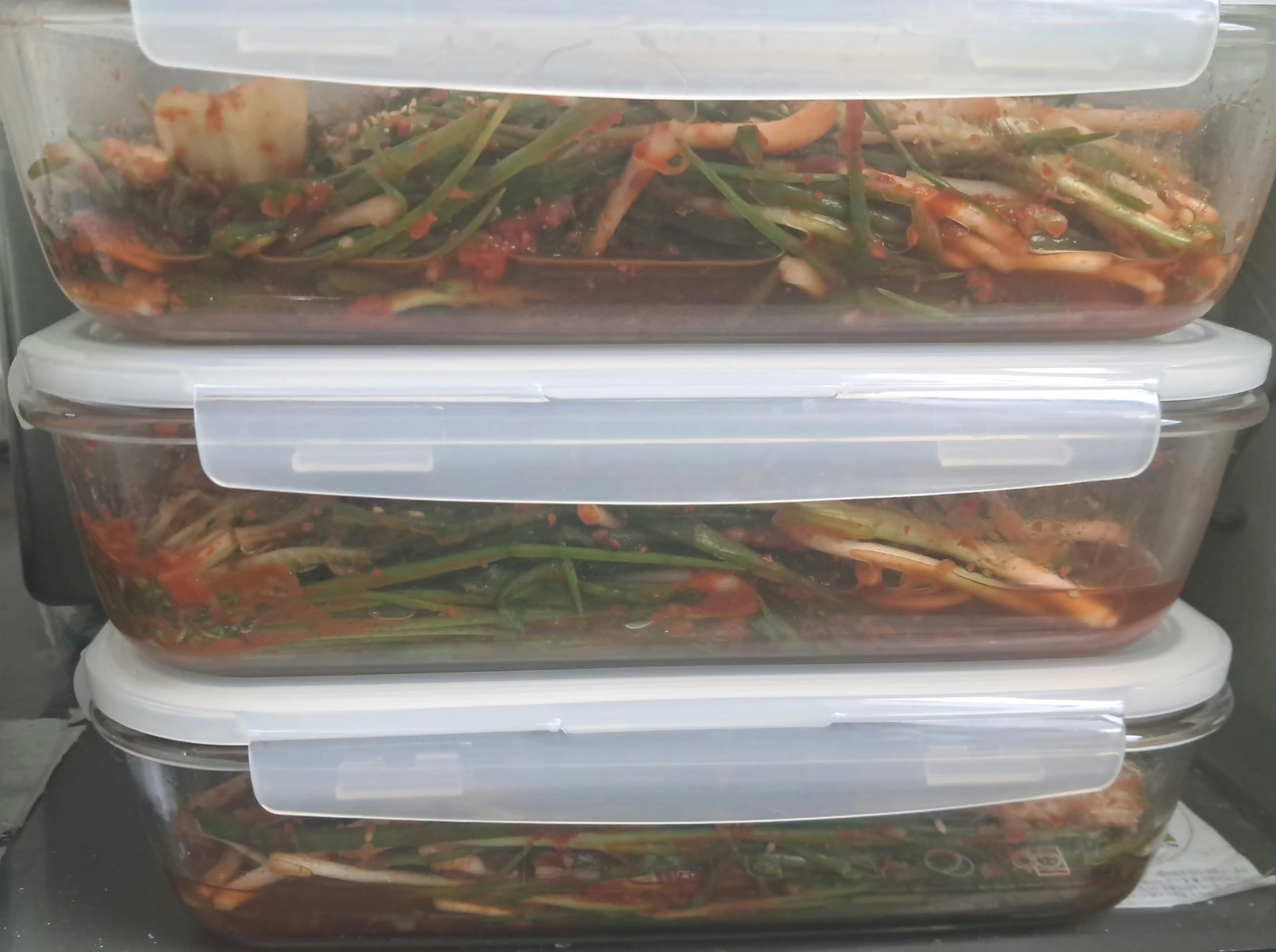 4. 다음날 잠에서 깨서 파의 밑부분을 버무려 통에 넣으면 끝난다.