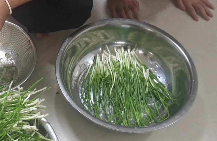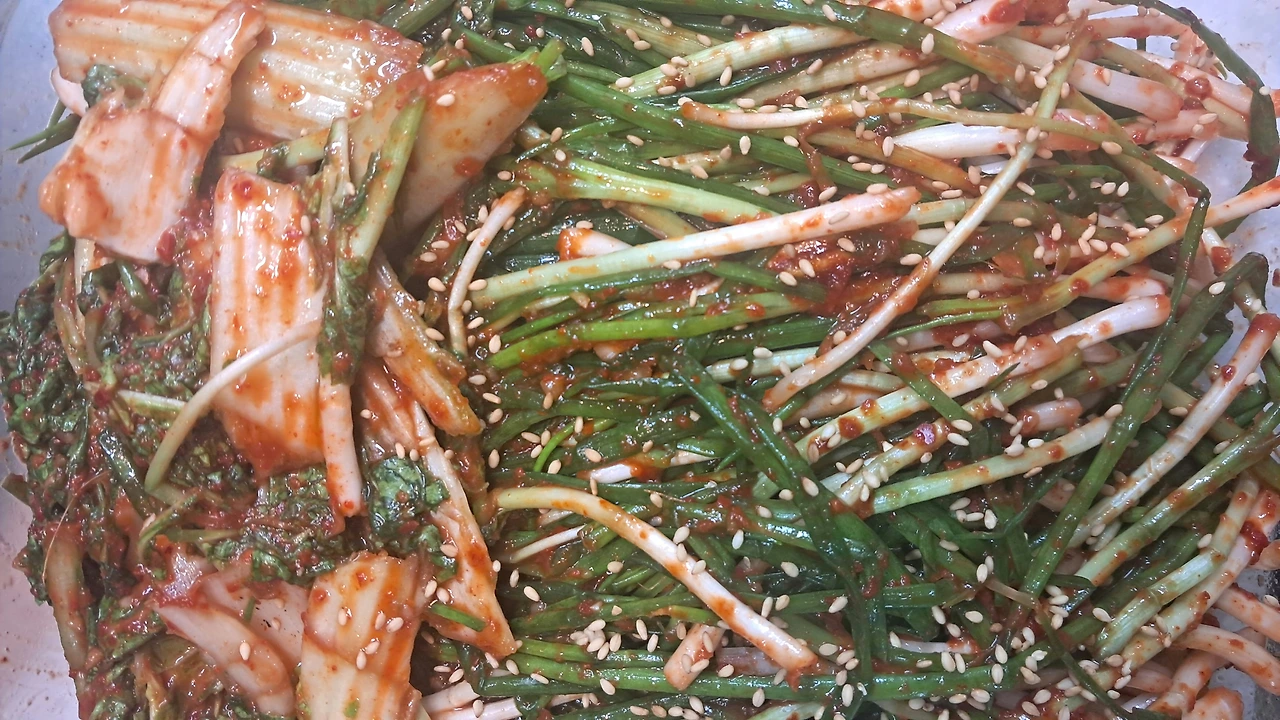 너무 가까이 심어진 배추를 뽑았는데 대충 썰어 파김치통 구석에 넣었다.